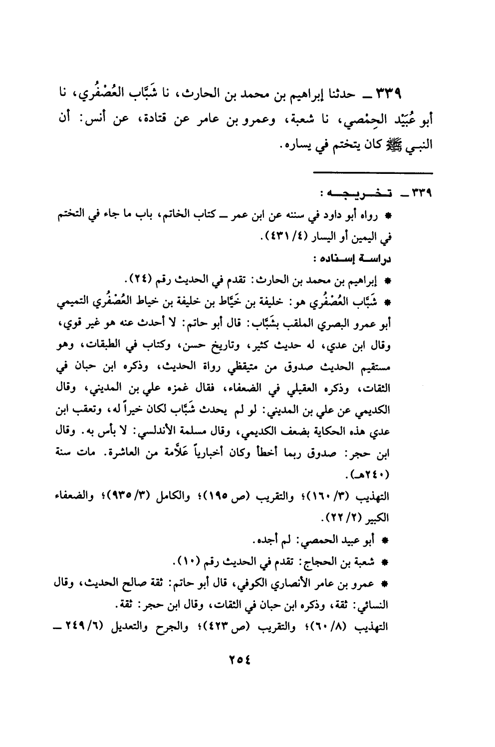 339 - حَدَّثَنَا إِبْرَاهِيمُ بْنُ مُحَمَّدِ بْنِ الْحَارِثِ، نَا شَبَابٌ الْعُصْفُرِيُّ، نَا أَبُو عُبَيْدٍ الْحِمْصِيُّ، نَا شُعْبَةُ، وَعَمْرُو بْنُ عَامِرٍ، عَنْ قَتَادَةَ، عَنْ أَنَسٍ، أَنَّ النَّبِيَّ صَلَّى اللهُ عَلَيْهِ وَسَلَّمَ كَانَ §يَتَخَتَّمُ فِي يَسَارِهِ