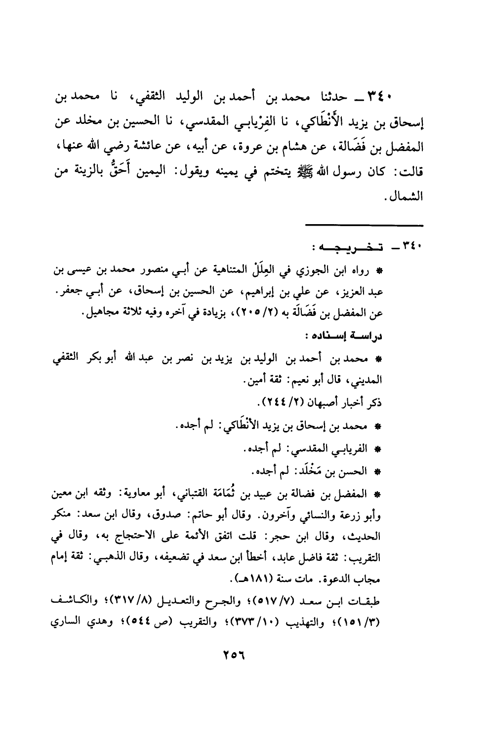 340 - حَدَّثَنَا مُحَمَّدُ بْنُ أَحْمَدَ بْنِ الْوَلِيدِ الثَّقَفِيُّ، نَا مُحَمَّدُ بْنُ إِسْحَاقَ بْنِ يَزِيدَ الْأَنْطَاكِيُّ، نَا الْفِرْيَابِيُّ الْمَقْدِسِيُّ، نَا الْحَسَنُ بْنُ مَخْلَدٍ، عَنِ الْمُفَضَّلِ بْنِ فَضَالَةَ، عَنْ هِشَامِ بْنِ عُرْوَةَ، عَنْ أَبِيهِ، عَنْ عَائِشَةَ، رَضِيَ اللَّهُ عَنْهَا قَالَتْ: كَانَ رَسُولُ اللَّهِ صَلَّى اللهُ عَلَيْهِ وَسَلَّمَ §يَتَخَتَّمُ فِي يَمِينِهِ، وَيَقُولُ: الْيَمِينُ أَحَقُّ بِالزِّينَةِ مِنَ الشِّمَالِ