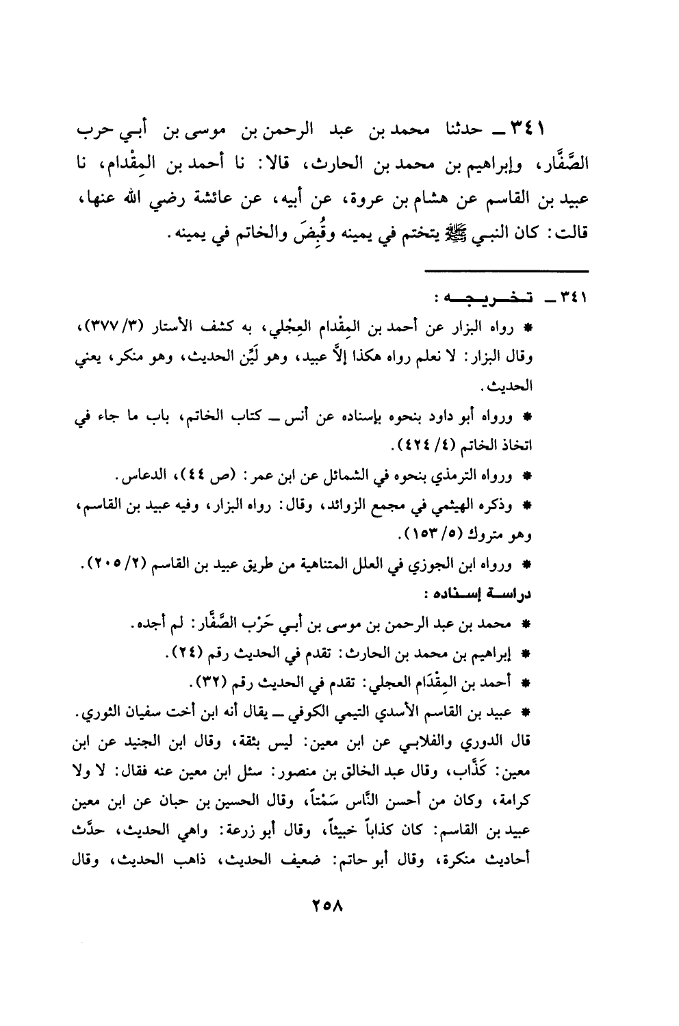 341 - حَدَّثَنَا مُحَمَّدُ بْنُ عَبْدِ الرَّحْمَنِ بْنِ مُوسَى بْنِ أَبِي حَرْبٍ الصَّفَّارُ، وَإِبْرَاهِيمُ بْنُ مُحَمَّدِ بْنِ الْحَارِثِ، قَالَا: نَا أَحْمَدُ بْنُ الْمِقْدَامِ، نَا عُبَيْدُ بْنُ الْقَاسِمِ، عَنْ هِشَامِ بْنِ عُرْوَةَ، عَنْ أَبِيهِ، عَنْ عَائِشَةَ، رَضِيَ اللَّهُ عَنْهَا قَالَتْ: كَانَ النَّبِيُّ صَلَّى اللهُ عَلَيْهِ وَسَلَّمَ §يَتَخَتَّمُ فِي يَمِينِهِ، وَقُبِضَ وَالْخَاتَمُ فِي يَمِينِهِ