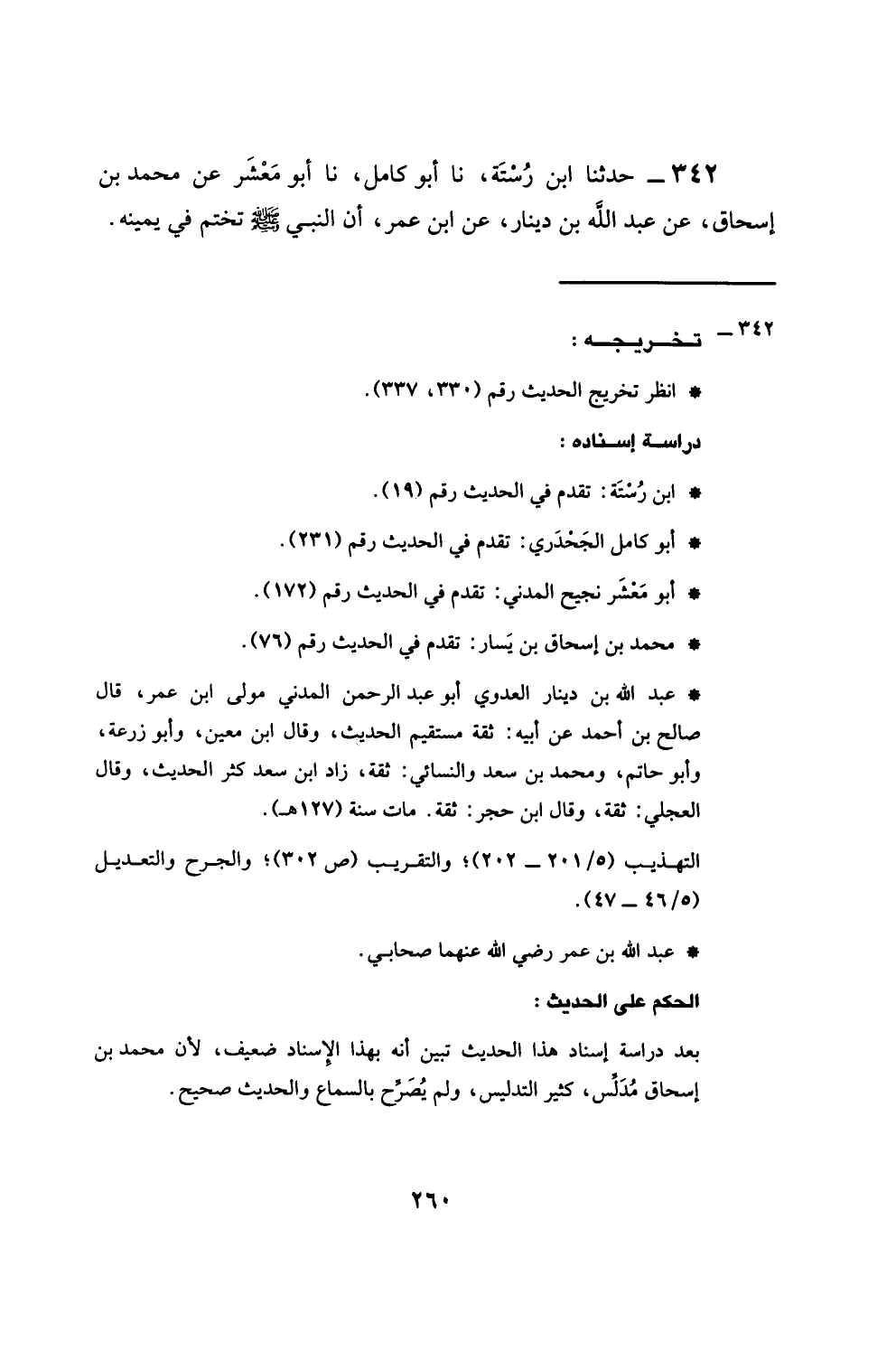 342 - حَدَّثَنَا ابْنُ رُسْتَةَ، نَا أَبُو كَامِلٍ، نَا أَبُو مَعْشَرٍ، عَنْ مُحَمَّدِ بْنِ إِسْحَاقَ، عَنْ عَبْدِ اللهِ بْنِ دِينَارٍ، عَنِ ابْنِ عُمَرَ، أَنَّ النَّبِيَّ صَلَّى اللهُ عَلَيْهِ وَسَلَّمَ §تَخَتَّمَ فِي يَمِينِهِ