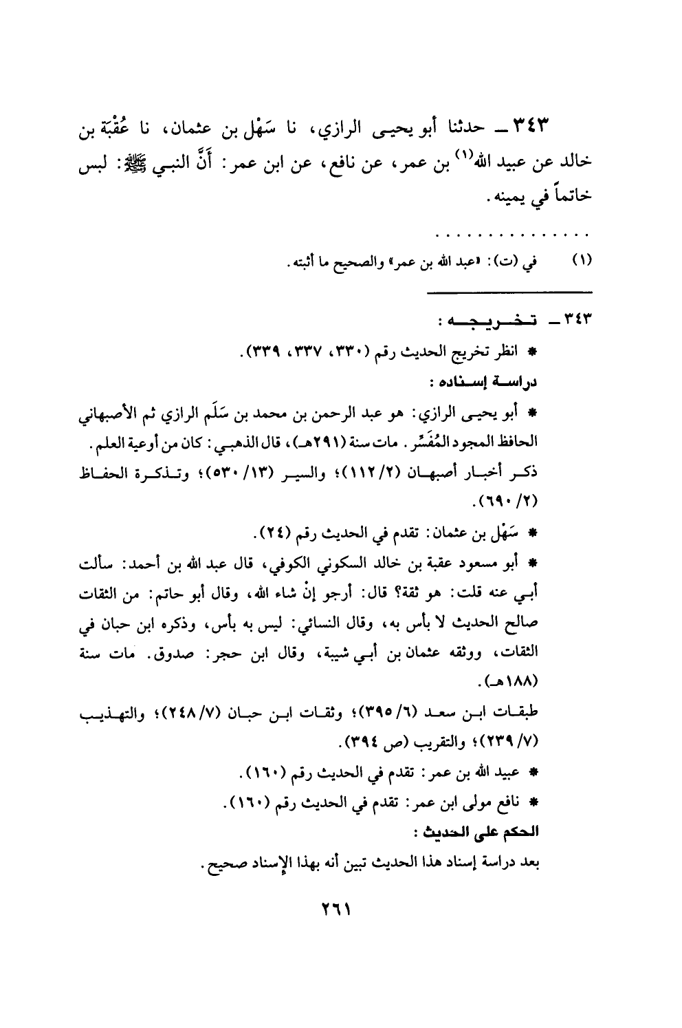 343 - حَدَّثَنَا أَبُو يَحْيَى الرَّازِيُّ، نَا سَهْلُ بْنُ عُثْمَانَ، نَا عُقْبَةُ بْنُ خَالِدٍ، عَنْ عُبَيْدِ اللَّهِ بْنِ عُمَرَ،: عَنْ نَافِعٍ، عَنِ ابْنِ عُمَرَ، أَنَّ النَّبِيَّ صَلَّى اللهُ عَلَيْهِ وَسَلَّمَ §لَبِسَ خَاتَمًا فِي يَمِينِهِ
