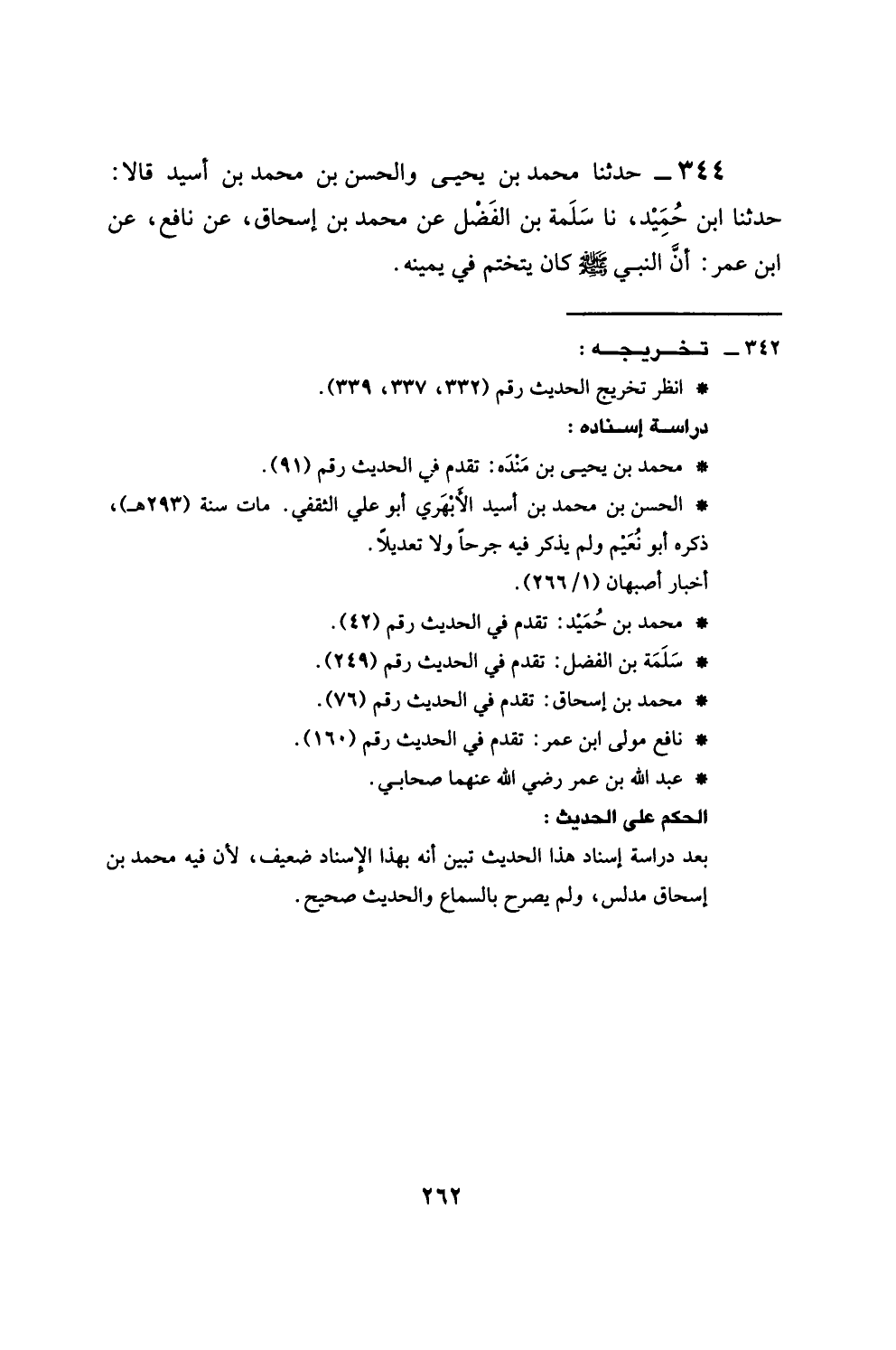 344 - حَدَّثَنَا مُحَمَّدُ بْنُ يَحْيَى، وَالْحَسَنُ بْنُ مُحَمَّدِ بْنِ أُسَيْدٍ، قَالَا: حَدَّثَنَا ابْنُ حُمَيْدٍ، نَا سَلَمَةُ بْنُ الْفَضْلِ، عَنْ مُحَمَّدِ بْنِ إِسْحَاقَ، عَنْ نَافِعٍ، عَنِ ابْنِ عُمَرَ، أَنَّ النَّبِيَّ صَلَّى اللهُ عَلَيْهِ وَسَلَّمَ كَانَ §يَتَخَتَّمُ فِي يَمِينِهِ