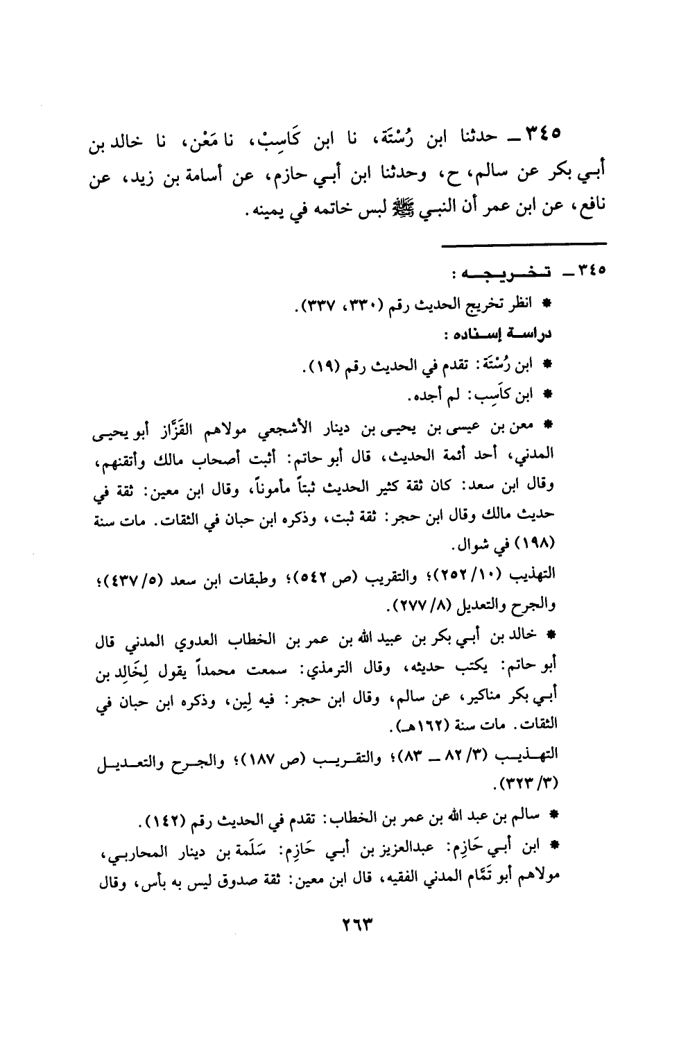 345 - حَدَّثَنَا ابْنُ رُسْتَةَ، نَا ابْنُ كَاسِبٍ، نَا مَعْنٌ، نَا خَالِدُ بْنُ أَبِي بَكْرٍ، عَنْ سَالِمٍ. ح. وَحَدَّثَنَا ابْنُ أَبِي حَازِمٍ، عَنْ أُسَامَةَ بْنِ زَيْدٍ، عَنْ نَافِعٍ، عَنِ ابْنِ عُمَرَ، أَنَّ النَّبِيَّ صَلَّى اللهُ عَلَيْهِ وَسَلَّمَ §لَبِسَ خَاتَمَهُ فِي يَمِينِهِ