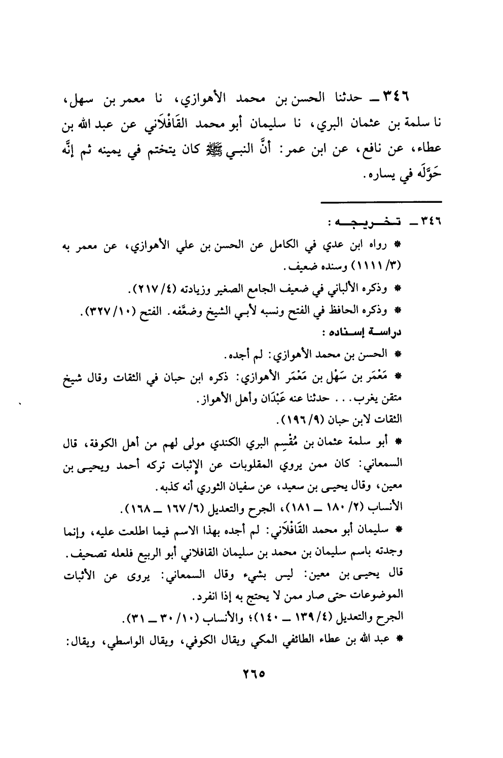 346 - حَدَّثَنَا الْحَسَنُ بْنُ مُحَمَّدٍ الْأَهْوَازِيُّ، نَا مَعْمَرُ بْنُ سَهْلٍ، نَا سَلَمَةُ بْنُ عُثْمَانَ الْبُرِّيُّ، نَا سُلَيْمَانُ أَبُو مُحَمَّدٍ الْقَافَلَاتِيُّ، عَنْ عَبْدِ اللَّهِ بْنِ عَطَاءٍ، عَنْ نَافِعٍ، عَنِ ابْنِ عُمَرَ، §أَنَّ النَّبِيِّ صَلَّى اللهُ عَلَيْهِ وَسَلَّمَ كَانَ يَتَخَتَّمُ فِي يَمِينِهِ، ثُمَّ إِنَّهُ حَوَّلَهُ فِي يَسَارِهِ