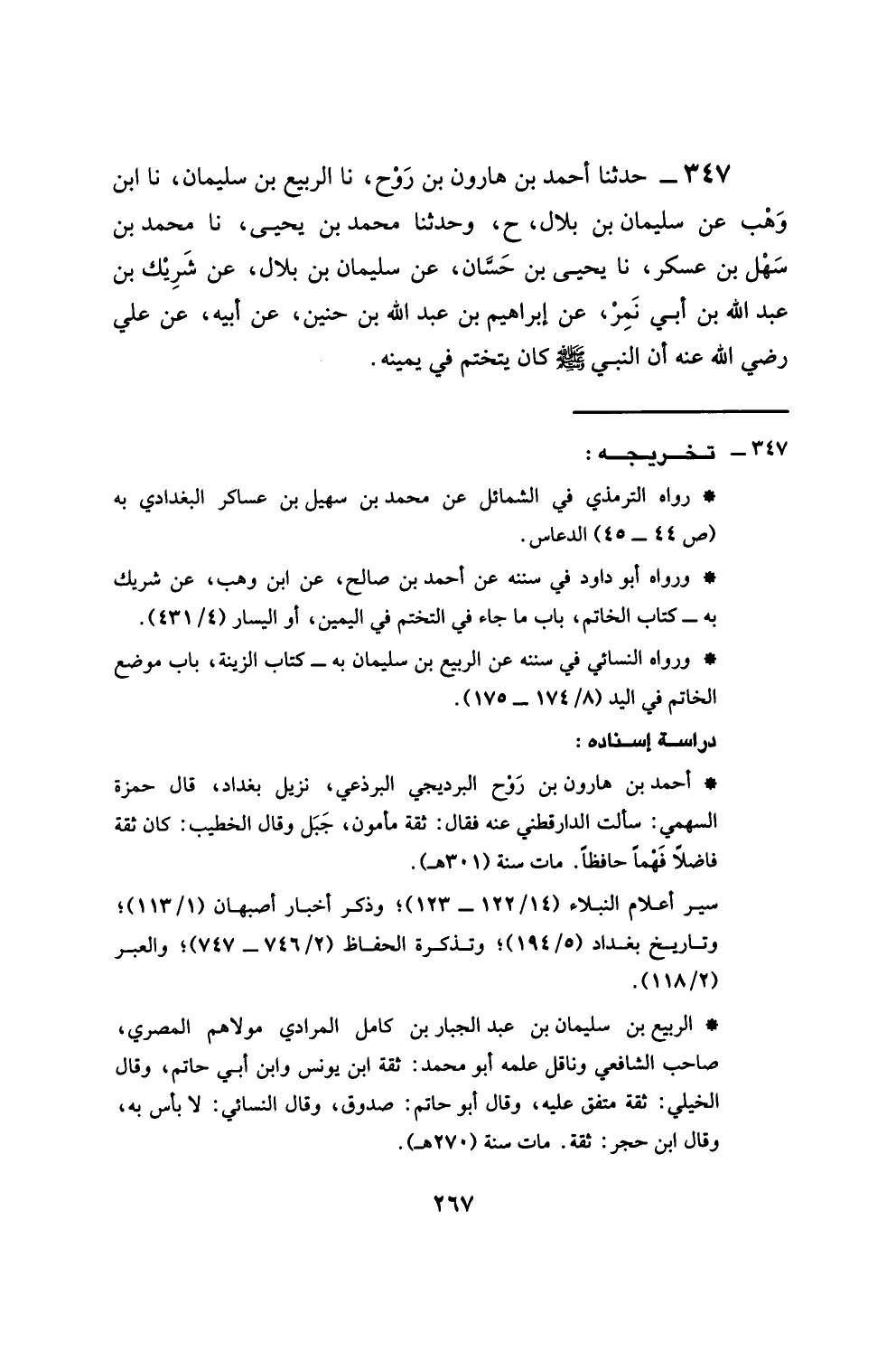 347 - حَدَّثَنَا أَحْمَدُ بْنُ هَارُونَ بْنِ رَوْحٍ، نَا الرَّبِيعُ بْنُ سُلَيْمَانَ، نَا ابْنُ وَهْبٍ، عَنْ سُلَيْمَانَ بْنِ بِلَالٍ. ح. وَحَدَّثَنَا مُحَمَّدُ بْنُ يَحْيَى، نَا مُحَمَّدُ بْنُ سَهْلِ بْنِ عَسْكَرٍ، نَا يَحْيَى بْنُ حَسَّانَ، عَنْ سُلَيْمَانَ بْنِ بِلَالٍ، عَنْ شَرِيكِ بْنِ عَبْدِ اللَّهِ بْنِ أَبِي نَمِرٍ، عَنْ إِبْرَاهِيمَ بْنِ عَبْدِ اللَّهِ بْنِ حُنَيْنٍ، عَنْ أَبِيهِ، عَنْ عَلِيٍّ، رَضِيَ اللَّهُ عَنْهُ: أَنَّ النَّبِيَّ صَلَّى اللهُ عَلَيْهِ وَسَلَّمَ كَانَ §يَتَخَتَّمُ فِي يَمِينِهِ