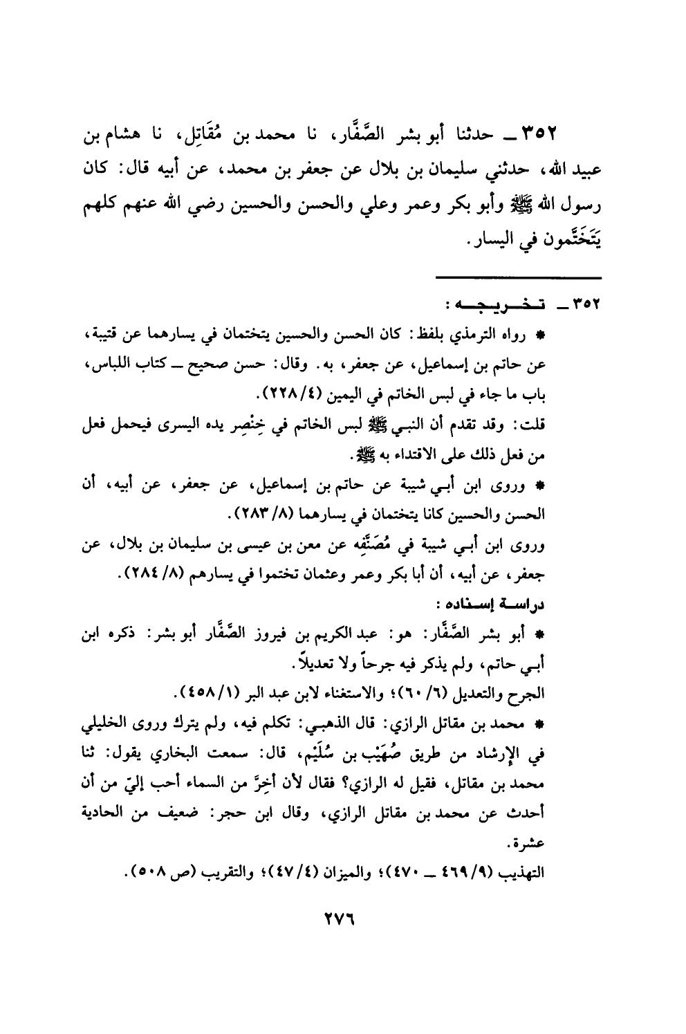 352 - حَدَّثَنَا أَبُو بِشْرٍ الصَّفَّارُ، نَا مُحَمَّدُ بْنُ مُقَاتِلٍ، نَا هِشَامُ بْنُ عُبَيْدِ اللَّهِ، حَدَّثَنِي سُلَيْمَانُ بْنُ بِلَالٍ، عَنْ جَعْفَرِ بْنِ مُحَمَّدٍ، عَنْ أَبِيهِ، قَالَ: §كَانَ رَسُولُ اللَّهِ صَلَّى اللهُ عَلَيْهِ وَسَلَّمَ وَأَبُو بَكْرٍ وعُمَرَ وَعَلِيُّ وَالْحَسَنُ وَالْحُسَيْنُ رَضِيَ اللَّهُ عَنْهُمْ، كُلُّهُمْ يَتَخَتَّمُونَ فِي الْيَسَارِ