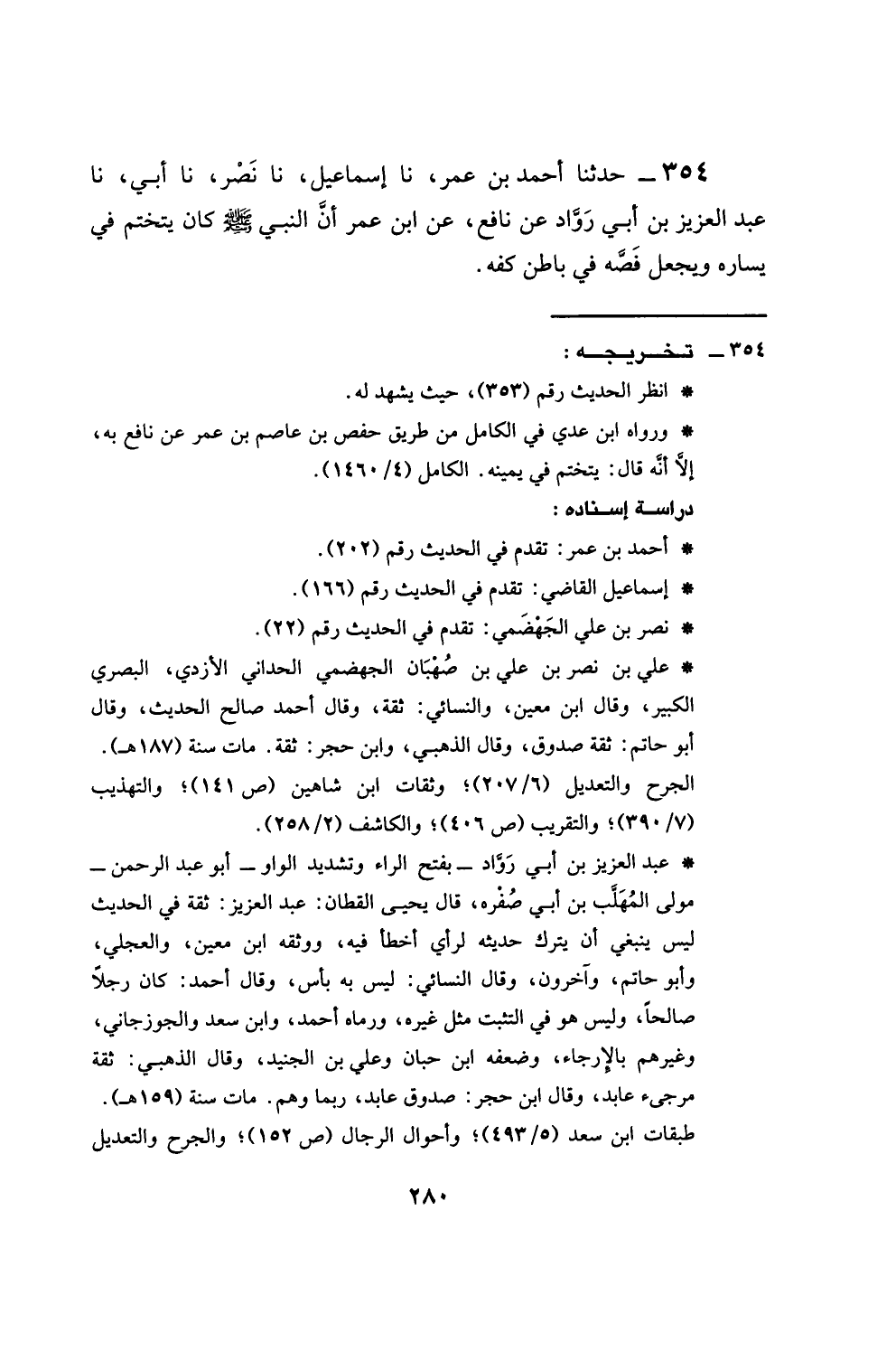 354 - حَدَّثَنَا أَحْمَدُ بْنُ عُمَرَ، نَا إِسْمَاعِيلُ، نَا نَصْرٌ، نَا أَبِي، نَا عَبْدُ الْعَزِيزِ بْنُ أَبِي رَوَّادٍ، عَنْ نَافِعٍ، عَنِ ابْنِ عُمَرَ، أَنَّ النَّبِيَّ صَلَّى اللهُ عَلَيْهِ وَسَلَّمَ كَانَ §يَتَخَتَّمُ فِي يَسَارِهِ، وَيَجْعَلُ فَصَّهُ فِي بَاطِنِ كَفِّهِ