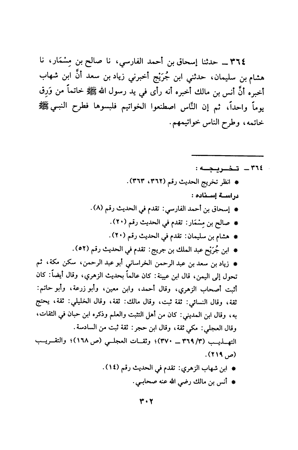 364 - حَدَّثَنَا إِسْحَاقُ بْنُ أَحْمَدَ الْفَارِسِيُّ، نَا صَالِحُ بْنُ مِسْمَارٍ، نَا هِشَامُ بْنُ سُلَيْمَانَ، حَدَّثَنِي ابْنُ جُرَيْجٍ، أَخْبَرَنِي زِيَادُ بْنُ سَعْدٍ، أَنَّ ابْنَ شِهَابٍ أَخْبَرَهُ: أَنَّ أَنَسَ بْنَ مَالِكٍ أَخْبَرَهُ: أَنَّهُ §رَأَى فِي يَدِ رَسُولِ اللَّهِ صَلَّى اللهُ عَلَيْهِ وَسَلَّمَ خَاتَمًا مِنْ وَرِقٍ يَوْمًا وَاحِدًا، ثُمَّ إِنَّ النَّاسَ اصْطَنَعُوا الْخَوَاتِيمَ فَلَبِسُوهَا، فَطَرَحَ النَّبِيُّ صَلَّى اللهُ عَلَيْهِ وَسَلَّمَ خَاتَمَهُ، وَطَرَحَ النَّاسُ خَوَاتِيمَهُمْ