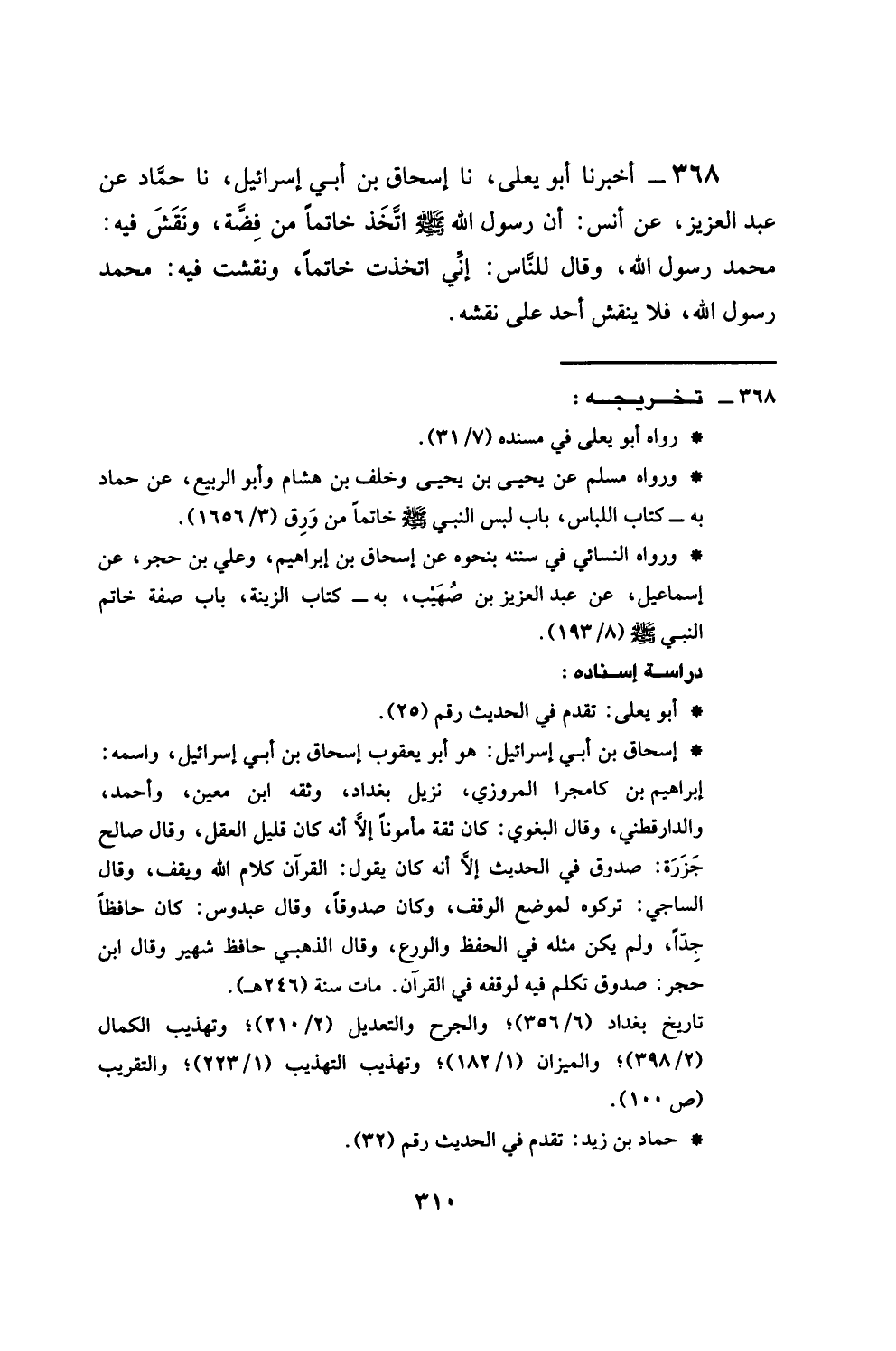 368 - أَخْبَرَنَا أَبُو يَعْلَى، نَا إِسْحَاقُ بْنُ أَبِي إِسْرَائِيلَ، نَا حَمَّادٌ، عَنْ عَبْدِ الْعَزِيزِ، عَنْ أَنَسٍ، أَنَّ رَسُولُ اللَّهِ صَلَّى اللهُ عَلَيْهِ وَسَلَّمَ اتَّخَذَ خَاتَمًا مِنْ فِضَّةٍ، وَنَقَشَ فِيهِ: مُحَمَّدٌ رَسُولُ اللَّهِ، وَقَالَ لِلنَّاسِ: §إِنِّي اتَّخَذْتُ خَاتَمًا، وَنَقَشْتُ فِيهِ: مُحَمَّدٌ رَسُولُ اللَّهِ فَلَا يَنْقُشُ أَحَدٌ عَلَى نَقْشِهِ