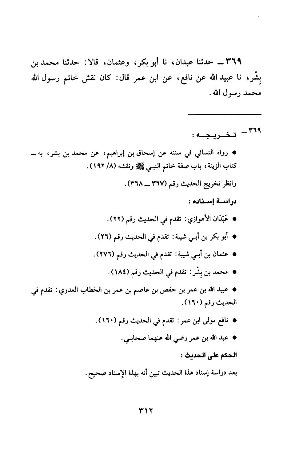 369 - حَدَّثَنَا عَبْدَانُ، نَا أَبُو بَكْرٍ، وَعُثْمَانُ، قَالَا: حَدَّثَنَا مُحَمَّدُ بْنُ بِشْرٍ، نَا عُبَيْدُ اللَّهِ، عَنْ نَافِعٍ، عَنِ ابْنِ عُمَرَ، قَالَ: كَانَ §نَقْشُ خَاتَمِ رَسُولِ اللَّهِ صَلَّى اللهُ عَلَيْهِ وَسَلَّمَ: مُحَمَّدٌ رَسُولُ اللَّهِ