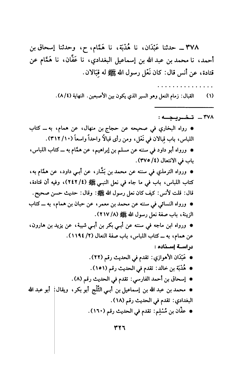 378 - حَدَّثَنَا عَبْدَانُ، نَا هُدْبَةُ، نَا هَمَّامٌ. ح. وَحَدَّثَنَا إِسْحَاقُ بْنُ أَحْمَدَ، نَا مُحَمَّدُ بْنُ عَبْدِ اللَّهِ بْنِ إِسْمَاعِيلَ الْبَغْدَادِيُّ، نَا عَفَّانُ، نَا هَمَّامٌ، عَنْ قَتَادَةَ، عَنْ أَنَسٍ، قَالَ: كَانَ §نَعْلُ رَسُولَ اللَّهِ صَلَّى اللهُ عَلَيْهِ وَسَلَّمَ لَهُ قِبَالَانِ.