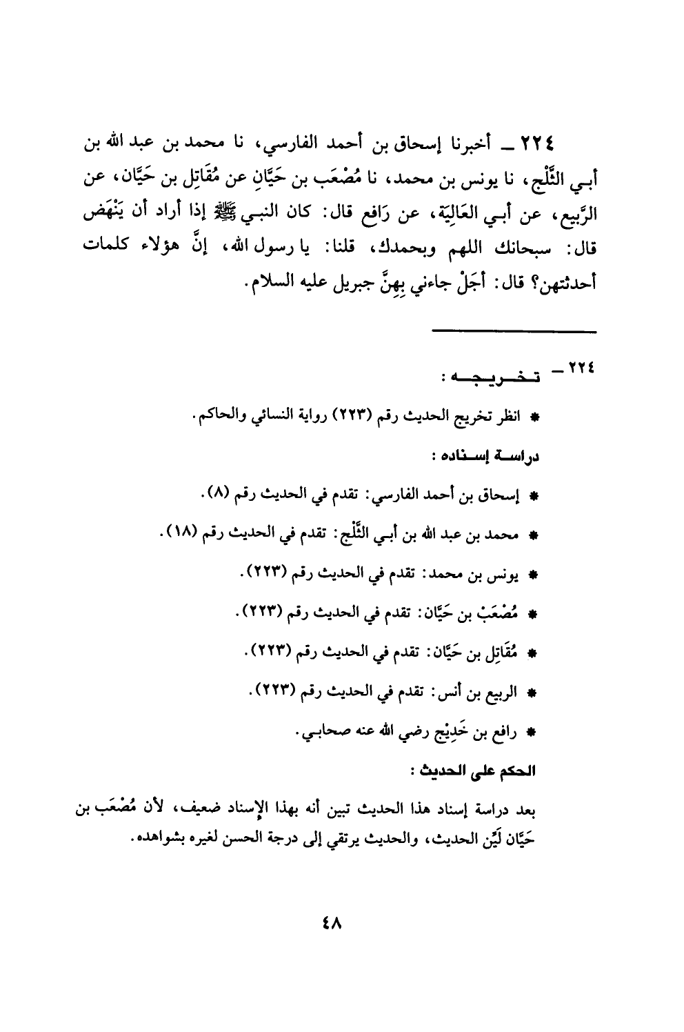 224 - أَخْبَرَنَا إِسْحَاقُ بْنُ أَحْمَدَ الْفَارِسِيُّ، نَا مُحَمَّدُ بْنُ عَبْدِ اللَّهِ بْنِ أَبِي الثَّلْجِ، نَا يُونُسُ بْنُ مُحَمَّدٍ، نَا مُصْعَبُ بْنُ حَيَّانَ، عَنْ مُقَاتِلِ بْنِ حَيَّانَ، عَنِ الرَّبِيعِ، عَنْ أَبِي الْعَالِيَةِ، عَنْ رَافِعٍ، قَالَ: كَانَ النَّبِيُّ صَلَّى اللهُ عَلَيْهِ وَسَلَّمَ §إِذَا أَرَادَ أَنْ يَنْهَضَ، قَالَ: سُبْحَانَكَ اللَّهُمَّ وَبِحَمْدِكَ. قُلْنَا: يَا رَسُولَ اللَّهِ إنْ هَؤُلَاءِ كَلِمَاتٍ أَحْدَثْتَهُنَّ؟ قَالَ: أَجَلْ، جَاءَنِي بِهِنَّ جِبْرِيلُ عَلَيْهِ السَّلَامُ