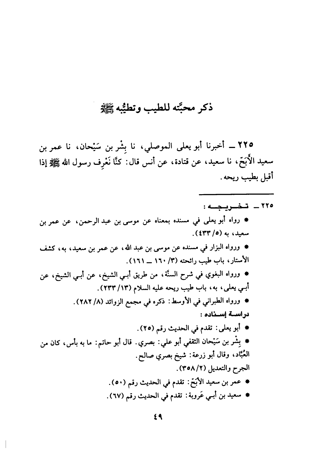 225 - أَخْبَرَنَا أَبُو يَعْلَى الْمَوْصِلِيُّ، نَا بِشْرُ بْنُ سَيْحَانُ، نَا عُمَرُ بْنُ سَعِيدٍ الْأَبَحُّ، نَا سَعِيدٌ، عَنْ قَتَادَةَ، عَنْ أَنَسٍ، قَالَ: §كُنَّا نَعْرِفُ رَسُولَ اللَّهِ صَلَّى اللهُ عَلَيْهِ وَسَلَّمَ إِذَا أَقْبَلَ بِطِيبِ رِيحِهِ