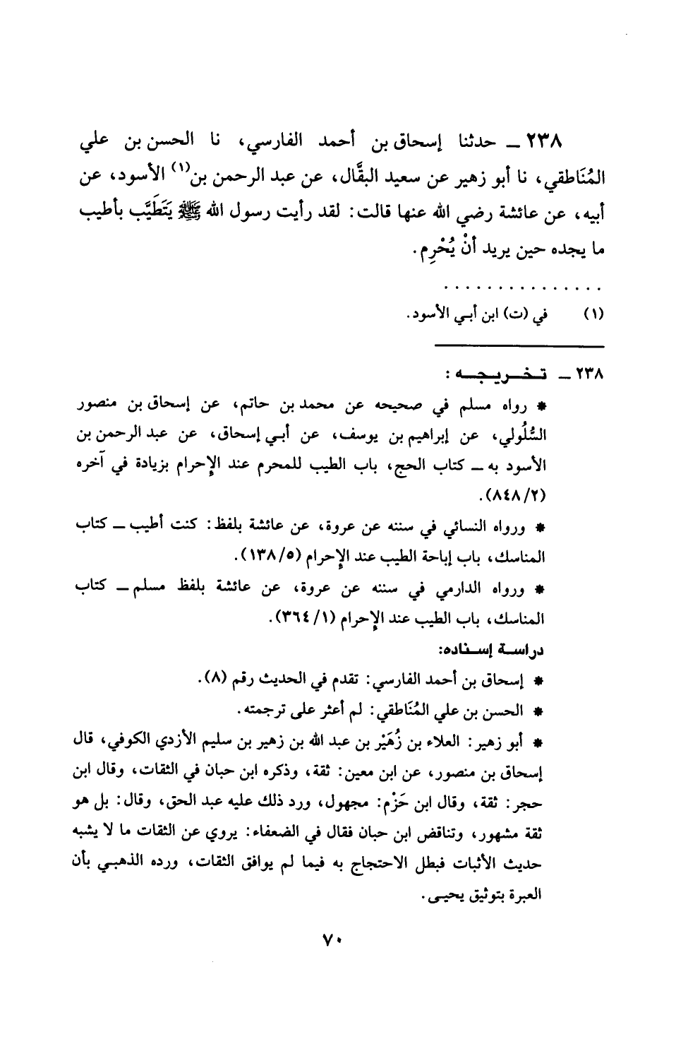 238 - حَدَّثَنَا إِسْحَاقُ بْنُ أَحْمَدَ الْفَارِسِيُّ، نَا الْحَسَنُ بْنُ عَلِيٍّ الْمَنَاطِقِيُّ، نَا أَبُو زُهَيْرٍ، عَنْ سَعِيدٍ الْبَقَّالِ، عَنْ عَبْدِ الرَّحْمَنِ بْنِ الْأَسْوَدِ، عَنْ أَبِيهِ، عَنْ عَائِشَةَ، رَضِيَ اللَّهُ عَنْهَا، قَالَتْ: لَقَدْ §رَأَيْتُ رَسُولَ اللَّهِ صَلَّى اللهُ عَلَيْهِ وَسَلَّمَ يَتَطَيَّبُ بِأَطْيَبِ مَا يَجِدُهُ حِينَ يُرِيدُ أَنْ يُحْرِمَ
