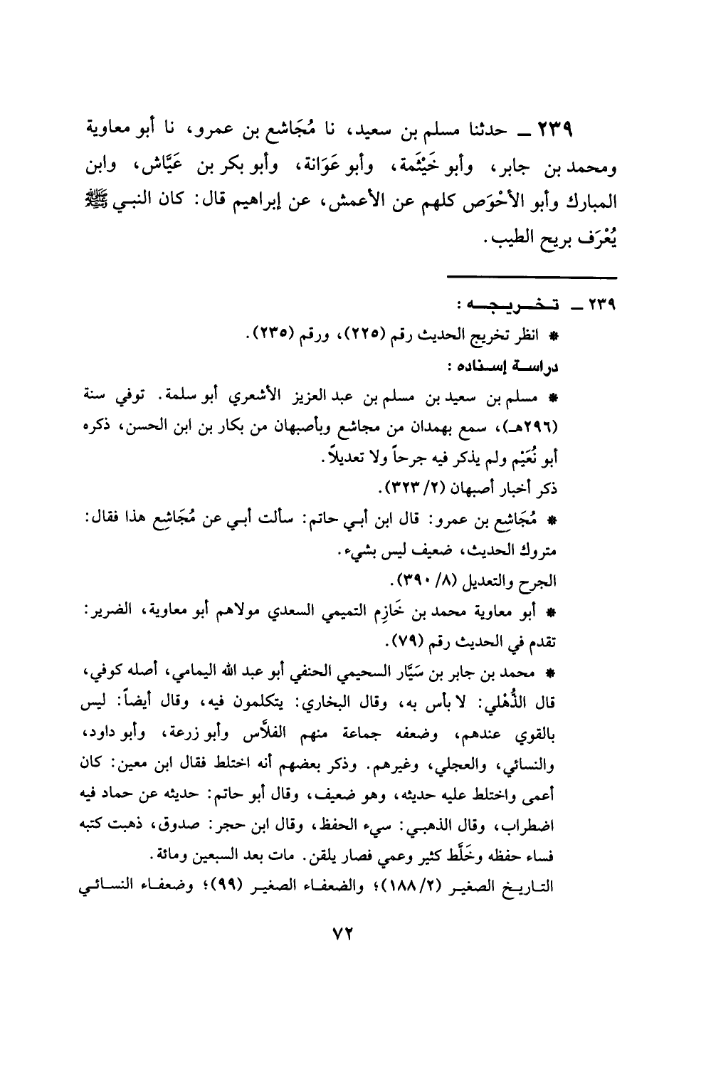 239 - حَدَّثَنَا مُسْلِمُ بْنُ سَعِيدٍ، نَا مُجَاشِعُ بْنُ عَمْرٍو، نَا أَبُو مُعَاوِيَةَ، وَمُحَمَّدُ بْنُ جَابِرٍ، وَأَبُو خَيْثَمَةَ، وَأَبُو عَوَانَةَ، وَأَبُو بَكْرِ بْنُ عَيَّاشٍ، وَابْنُ الْمُبَارَكِ، وَأَبُو الْأَحْوَصِ كُلُّهُمْ، عَنِ الْأَعْمَشِ، عَنْ إِبْرَاهِيمَ، قَالَ: كَانَ النَّبِيُّ صَلَّى اللهُ عَلَيْهِ وَسَلَّمَ §يُعْرَفُ بِرِيحِ الطِّيبِ