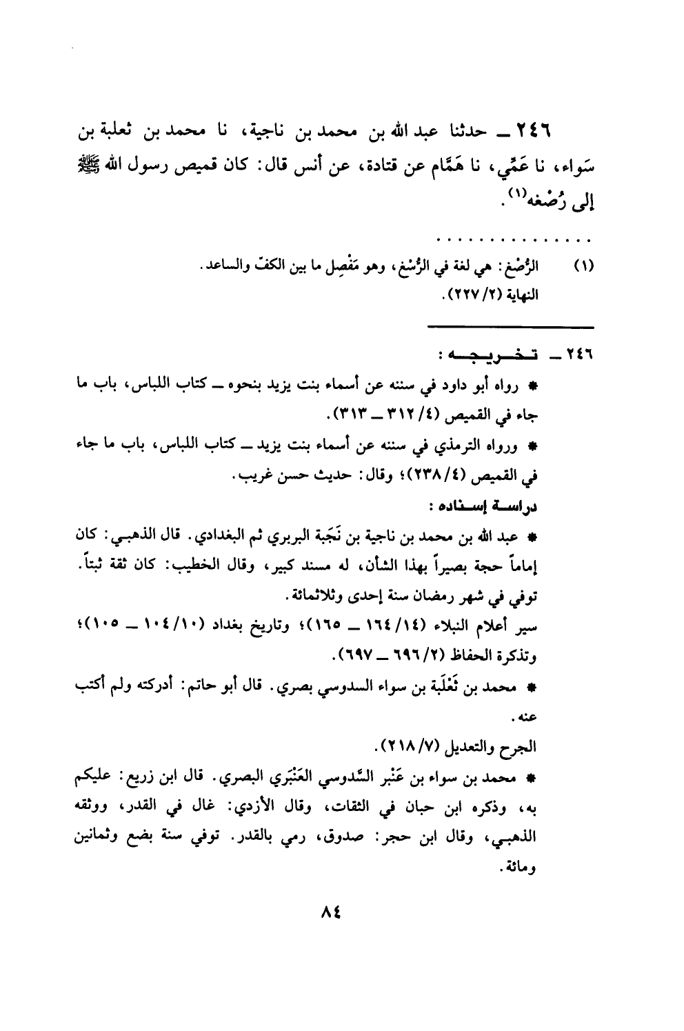 246 - حَدَّثَنَا عَبْدُ اللَّهِ بْنُ مُحَمَّدِ بْنِ نَاحِيَةَ، نَا مُحَمَّدُ بْنُ ثَعْلَبَةَ بْنِ سَوَاءَ، نَا عَمِّي، نَا هَمَّامٌ، عَنْ قَتَادَةَ، عَنْ أَنَسٍ، قَالَ: كَانَ §قَمِيصُ رَسُولَ اللَّهِ صَلَّى اللهُ عَلَيْهِ وَسَلَّمَ إِلَى رُسْغِهِ