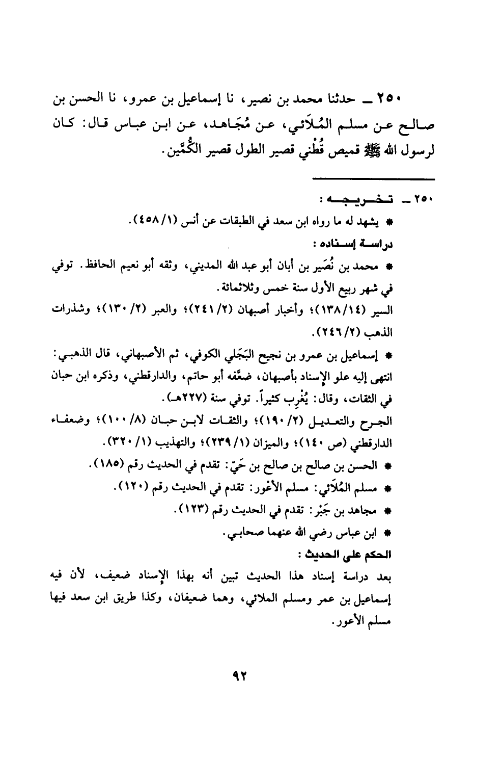250 - حَدَّثَنَا مُحَمَّدُ بْنُ نُصَيْرٍ، نَا إِسْمَاعِيلُ بْنُ عَمْرٍو، نَا الْحَسَنُ بْنُ صَالِحٍ، عَنْ مُسْلِمٍ الْمُلَائِيِّ، عَنْ مُجَاهِدِ، عَنِ ابْنِ عَبَّاسٍ، قَالَ: كَانَ §لِرَسُولُ اللَّهِ صَلَّى اللهُ عَلَيْهِ وَسَلَّمَ قَمِيصٌ قُطْنِيُّ قَصِيرُ الطُّوَلِ، قَصِيرُ الْكُمَّيْنِ