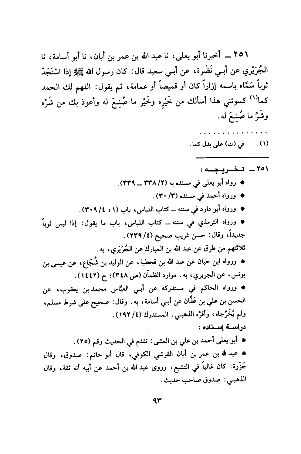 251 - أَخْبَرَنَا أَبُو يَعْلَى، بْنُ عُمَرَ بْنِ أَبَانَ، نَا أَبُو أُسَامَةَ، نَا الْجُرَيْرِيُّ، عَنْ أَبِي نَضْرَةَ، عَنْ أَبِي سَعِيدٍ، قَالَ: كَانَ رَسُولُ اللَّهِ صَلَّى اللهُ عَلَيْهِ وَسَلَّمَ §إِذَا اسْتَجَدَّ ثَوْبًا سَمَّاهُ بِاسْمِهِ، إِزَارًا كَانَ أَوْ قَمِيصًا، أَوْ عِمَامَةً، ثُمَّ يَقُولُ: اللَّهُمَّ لَكَ الْحَمْدُ كَمَا كَسَوْتَنِي هَذَا، أَسْأَلُكُ مِنْ خَيْرِهِ، وَخَيْرِ مَا صُنِعَ لَهُ، وَأَعُوذُ بِكَ مِنْ شَرِّهِ، وَشَرِّ مَا صُنِعَ لَهُ