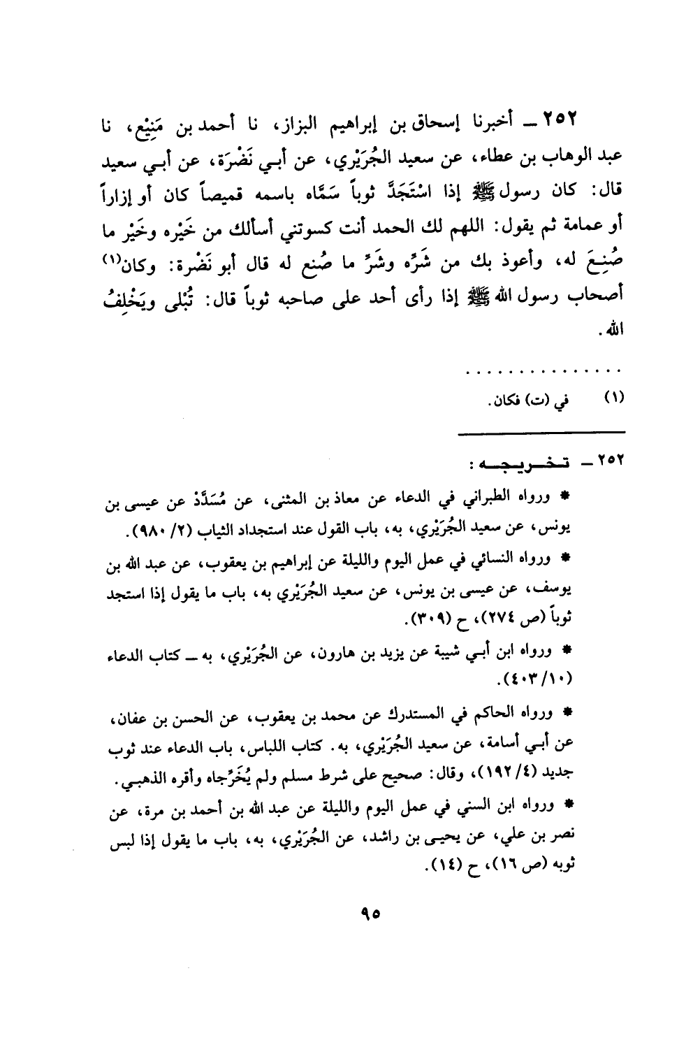 252 - أَخْبَرَنَا إِسْحَاقُ بْنُ إِبْرَاهِيمَ الْبَزَّارُ، نَا أَحْمَدُ بْنُ مَنِيعٍ، نَا عَبْدُ الْوَهَّابِ بْنُ عَطَاءٍ، عَنْ سَعِيدٍ الْجُرَيْرِيِّ، عَنْ أَبِي نَضْرَةَ، عَنْ أَبِي سَعِيدٍ، قَالَ: كَانَ رَسُولُ اللَّهِ صَلَّى اللهُ عَلَيْهِ وَسَلَّمَ إِذَا اسْتَجَدَّ ثَوْبًا سَمَّاهُ بِاسْمِهِ، قَمِيصًا كَانَ، أَوْ إِزَارًا، أَوْ عِمَامَةً، ثُمَّ يَقُولُ: §اللَّهُمَّ لَكَ الْحَمْدُ أَنْتَ كَسَوْتَنِي، أَسْأَلُكَ مِنْ خَيْرِهِ، وَخَيْرِ مَا صُنِعَ لَهُ، وَأَعُوذُ بِكَ مِنْ شَرِّهِ، وَشَرِّ مَا صُنِعَ لَهُ. قَالَ أَبُو نَضْرَةَ: وَكَانَ أَصْحَابُ رَسُولِ اللَّهِ صَلَّى اللهُ عَلَيْهِ وَسَلَّمَ إِذَا رَأَى أَحَدٌ عَلَى صَاحِبِهِ ثَوْبًا قَالَ: تُبْلِي، وَيُخِلِفُ اللَّهُ