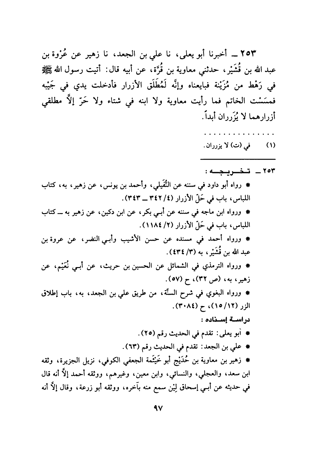 253 - أَخْبَرَنَا أَبُو يَعْلَى، نَا عَلِيُّ بْنُ الْجَعْدِ، نَا زُهَيْرٌ، عَنْ عُرْوَةَ بْنِ عَبْدِ اللَّهِ بْنِ قُشَيْرٍ، حَدَّثَنِي مُعَاوِيَةُ بْنُ قُرَّةَ، عَنْ أَبِيهِ، قَالَ: §أَتَيْتُ رَسُولَ اللَّهِ صَلَّى اللهُ عَلَيْهِ وَسَلَّمَ فِي رَهْطٍ مِنْ مُزَيْنَةَ، فَبَايَعْنَاهُ وَإِنَّهُ لَمُطْلَقُ الْأَزْرَارِ، فَأَدْخَلْتُ يَدِي فِي جَيْبِهِ فَمَسِسْتُ الْخَاتَمَ. فَمَا رَأَيْتُ مُعَاوِيَةَ وَلَا ابْنَهُ فِي شِتَاءٍ وَلَا حَرٍّ إِلَّا مُطْلِقِي أَزْرَارِهِمَا لَا يَزُرَّانِ أَبَدًا
