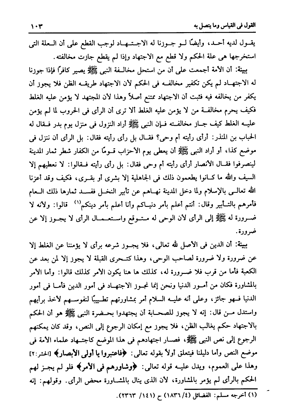 ببينة: أن الدين في الأصل لله تعالى فلا يجوز شرعه برأى لا يؤمننا عن الغلط إلا عن ضررورة ولا ضرورة لصاحب الوحى وهذا كتحرى القبلة لا يجوز إلا لمن بعد عن الكعبة فأما من قرب فلا ضرورة له كذلك ها هنا يكون الأمر كذلك قالوا: وأما الأمر بالمشاورة فكان من أمور الدنيا ونحن إنما نجوز الاجتهاد في أمور الدين فأما في أمور الدنيا فهو جائز وعلى أنه صلى الله عليه وسلم أمر بمشاورتهم تطييبا لنفوسهم لأخذ برأيهم واستدل من قال: إنه لا يجوز للصحابة أن يجتهدوا بحضرة النبى صلى الله عليه وسلم هو أن الحكم بالاجتهاد حكم يغالب الظن فلا يجوز مع إمكان الرجوع إلى النص وقد كان يمكنهم الرجوع إلى نص النبى صلى الله عليه وسلم فصار اجتهادهم في هذا الموضع كاجتهاد علماء الأمة في موضع النص وأما دليلنا فيتعلق أولا بقوله تعالى: {فَاعْتَبِرُوا يَا أُولِي الْأَبْصَارِ} [الحشر: 2] وهذا على العموم ويدل عليه قوله تعالى: {وَشَاوِرْهُمْ فِي الْأَمْرِ} فلو لم يجز لهم الحكم بالرأى لم يؤمر بالمشاورة لأن الذي ينال بالمشاورة محض الرأي. وقولهم: إنه