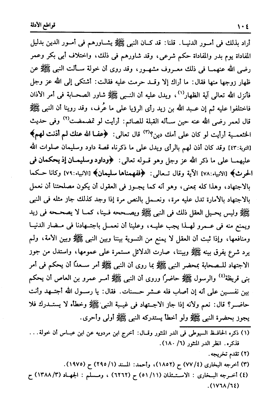 أراد بذلك في أمور الدنيا. قلنا: قد كان النبى صلى الله عليه وسلم يشاورهم في أمور الدين بدليل المفاداة يوم بدر والمفاداة حكم شرعى وقد شاورهم في ذلك واختلاف أبى بكر وعمر رضى الله عنهما في ذلك معروف مشهور وقد روى أن خولة سألت النبى صلى الله عليه وسلم عن ظهار زوجها منها فقال: "ما أراك إلا وقد حرمت عليه" فقالت: أشتكى إلى الله عز وجل فأنزل الله تعالى آية الظهار1 ويدل عليه أن النبى صلى الله عليه وسلم شاور الصحابة في أمر الأذان فاختلفوا عليه ثم إن عبد الله بن زيد رأى الرؤيا على ما عرف وقد روينا أن النبى صلى الله عليه وسلم قال لعمر رضى الله عنه حين سأله القبلة للصائم: "أرأيت لو تمضمضت" 2 وفي حديث الخثعمية "أرأيت لو كان على أمك دين؟ " 3 قال تعالى: {عَفَا اللَّهُ عَنْكَ لِمَ أَذِنْتَ لَهُمْ} [التوبة: 43] وقد كان أذن لهم بالرأى ويدل على ما ذكرناه قصة داود وسليمان صلوات الله عليهما على ما ذكر الله عز وجل وهو قوله تعالى: {وَدَاوُدَ وَسُلَيْمَانَ إِذْ يَحْكُمَانِ فِي الْحَرْثِ} [الأنبياء: 78] الآية وقال تعالى: {فَفَهَّمْنَاهَا سُلَيْمَانَ} [الأنبياء: 79] وكانا حكما بالاجتهاد وهذا كله بمعنى وهو أنه كما يجوز في العقول أن يكون مصلحتنا أن نعمل بالاجتهاد بالأمارة تددل عليه مرة ونعمل بالنص مرة إذا وجد كذلك جاز مثله في النبى صلى الله عليه وسلم وليس يحيل العقل ذلك في النبى صلى الله عليه وسلم ويصححه فينا كما لا يصححه في زيد ويمنع منه في عمرو لهذا يجب عليه وعلينا أن نعمل باجتهادنا في مضار الدنيا ومنافعها وإذا ثبت أن العقل ايمنع من التسوية بيننا وبين النبى صلى الله عليه وسلم وبين الأمة ولم يرد شرع يفرق بينه صلى الله عليه وسلم وبيننا صارت الدلائل مستمرة على عمومها واستدل من جوز الاجتهاد للصحابة بمحضر النبى صلى الله عليه وسلم بما روى أن النبى صلى الله عليه وسلم أمر سعدا أن يحكم في أمر بنى قريظة4 والرسول صلى الله عليه وسلم حاضرا وروى أن النبي صلى الله عليه وسلم أمر عمرو بن العاص أن يحكم بين نفسين على أنه إن أصاب فله عشر حسنات. فقال: يا رسول الله أجتهد وأنت حاضر؟ قال: "نعم" ولأنه إذا جاز الاجتهاد في غيبة النبى صلى الله عليه وسلم وخطأه لا يستدرك فلا يجوز بحضرة النبى صلى الله عليه وسلم ولو أخطأ يستدركه النبى صلى الله عليه وسلم أولى وأحرى.
