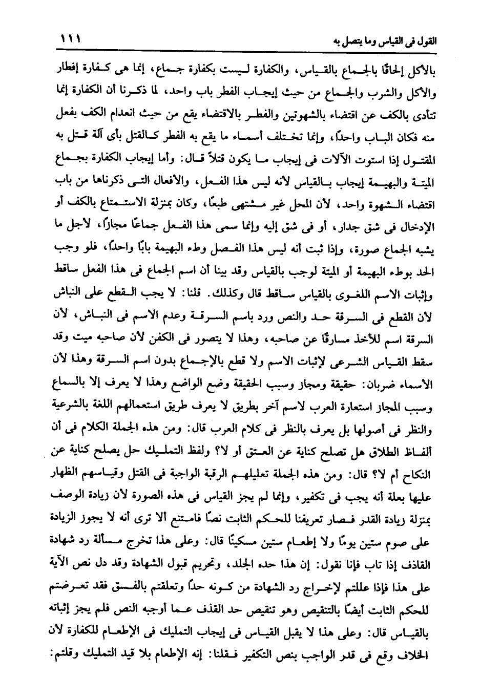 بالأكل إلحاقا بالجماع بالقياس والكفارة ليست بكفارة جماع إنما هى كفارة إفطار والأكل والشرب والجماع من حيث إيجاب الفطر باب واحد لما ذكرنا أن الكفارة أنما تتأدى بالكف عن اقتضاء بالشهوتين والفطر بالاقتضاء يقع من حيث انعدامم الكف بفعل منه فكان الباب واحدا وأنما تختلف أسماء ما يقع به الفطر كالقتل بأى آلة قتل به المقتول إذا استوت الآلات في إيجاب ما يكون قتلا قال: وأما إيجاب الكفارة بجماع الميتة والبهيمة إيجاب بالقياس لأنه ليس هذا الفعل والأفعال التي ذكرناها من باب اقتضاء الشهوة واحد لأن المحل غير مشتهى طبعا وكان بمنزلة الاستمتاع بالكف أو الإدخال في شق جدار أو في شق إليه وإنما سمى هذا الفعل جماعا مجازا لأجل ما يشبه الجماع صورة وإذا ثبت أنه ليس هذا الفصل وطء البهيمة بابا واحدا فلو وجب الحد بوطء البهيمة أو الميتة لوجب بالقياس وقد بينا أن اسم الجماع في هذا الفعل ساقط وإثبات الاسم اللغوي بالقياس ساقط قال: كذلك قلنا: لا يجب القطع على النباش لأن القطع في السرقة حد والنص ورد باسم السرقة وعدم الاسم في النباش لأن السرقة اسم للأخذ مسارقا عن صاحبه وهذا لا يتصور في الكفن لأن صاحبه ميت وقد سقط القياس الشرعى لإثبات الاسم ولا قطع بالاجماع بدون اسم السرقة وهذا لأن الأسماء ضربان حقيقة ومجاز وسبب الحقيقة وضع الواضع وهذا لا يعرف إلا بالسماع وسبب المجاز استعارة العرب لاسم آخر بطريق لا يعرف طريق استعمالهم اللغة الشرعية والنظر في أصولها بل يعرف بالنظر في كلام العرب قال: ومن هذه الجملة الكلام في أن ألفاظ الطلاق هل تصلح كناية عن العتق أو لا؟ ولفظ التمليك حل يصلح كناية عن النكاح أم لا؟ قال: ومن هذه الجملة تعليلهم الرقبة الواجبة في القتل وقياسهم الظهار عليها بعلة أنه يجب في تكفير وإنما لم يجز القياس في هذه الصورة لأن زيادة الوصف بمنزلة زيادة القدر فصار تعريفنا للحكم الثابت نصا فامتنع ألا ترى أنه لا يجوز الزيادة على صوم ستين يوما ولا إطعام ستين مسكينا قال: وعلى هذا تخرج مسألة رد شهادة القاذف إذا تاب فإنا نقول إن هذا حده الجلد وتحريم قبول الشهادة وقد دل نص الآية على هذا فإذا عللتم لإخراج رد الشهادة من كونه حدا وتعلقتم بالفسق فقد تعرضتم للحكم الثابت أيضا بالتنقيص وهو تنقيض حد القذف عما أوجبه النص فلم يجز إثباته بالقياس قال: وعلى هذا لا يقبل القياس في إيجاب التمليك في الإطعام للكفارة لأن الخلاف وقع في قدر الواجب بنص التكفير فقلنا: إنه الإطعام بلا قيد التمليك وقلتم: