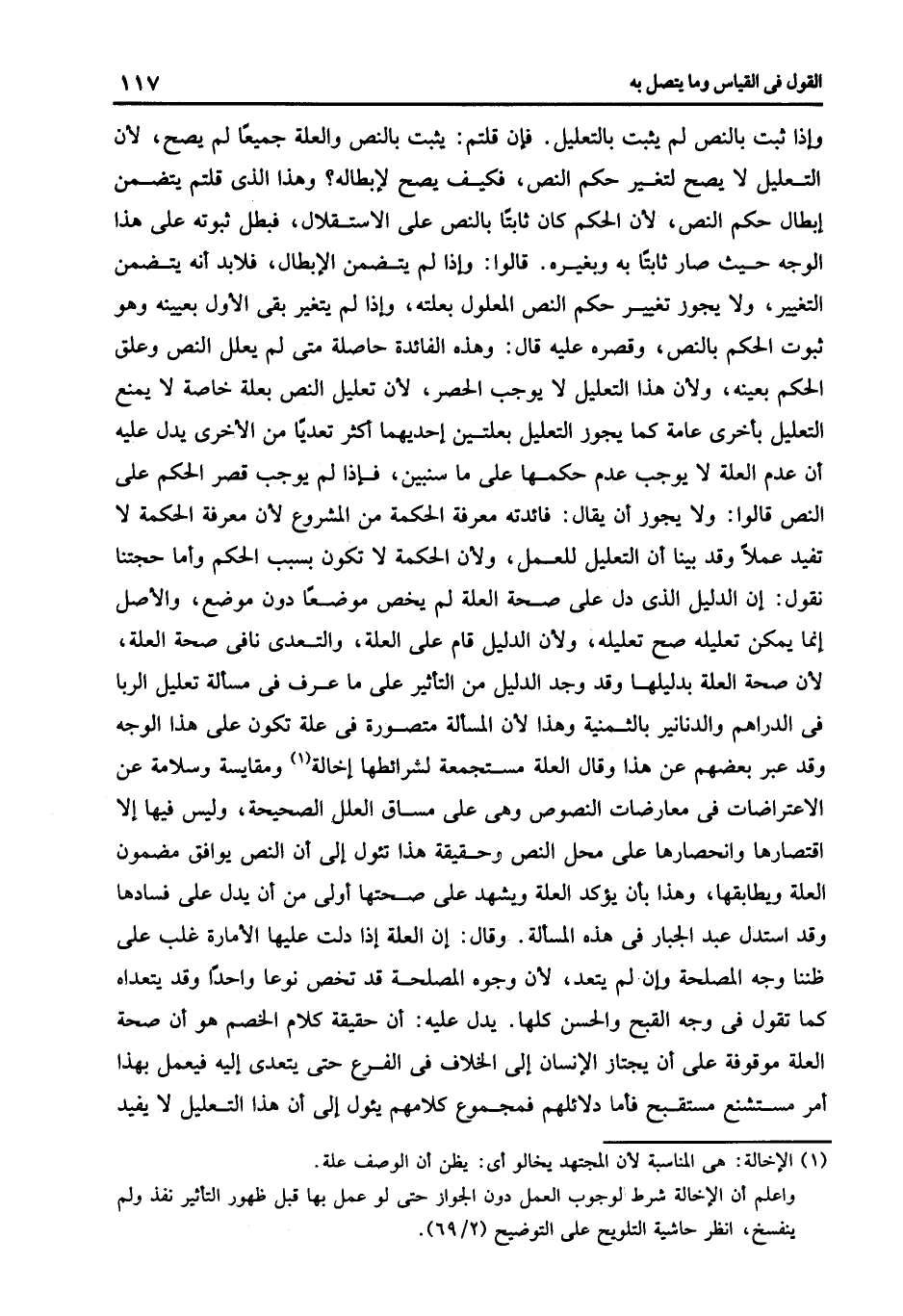 وإذا ثبت بالنص لم يثبت بالتعليل. فإن قلتم: يثبت بالنص والعلة جميعا لم يصح لأن التعليل لا يصح لتغير حكم النص فكيف يصح لإبطاله؟ وهذا الذي قلتم يتضمن إبطال حكم النص لأن الحكم كان ثابتا بالنص على الاستقلال فبطل ثبوته على هذا الوجه حيث صار ثابتا به وبغيره. قالوا: وإذا لم يتضمن الإبطال فلابد أنه يتضمن التغيير ولا يجوز تغيير حكم النص المعلول بعلته وإذا لم يتغير بقى الأول بعيينه وهو ثبوت الحكم بالنص وقصره عليه قال: وهذه الفائدة حاصلة متى لم يعلل النص وعلق الحكم بعينه ولأن هذا التعليل لا يوجب الحصر لأن تعليل النص بعلة خاصة لا يمنع التعليل بأخرى عامة كما يجوز التعليل بعلتين إحديهما أكثر تعديا من الأخرى يدل عليه أن عدم العلة لا يوجب عدم حكمها على ما سنبين فإذا لم يوجب قصر الحكم على النص قالوا: ولا يجوز أن يقال: فائدته معرفة الحكمة من المشروع لأن معرفة الحكمة لا تفيد عملا وقد بينا أن التعليل للعمل ولأن الحكمة لا تكون بسبب الحكم وأما حجتنا نقول إن الدليل الذى دل على صحة العلة لم يخص موضعا دون موضع والأصل إنما يمكن تعليله صح تعليله ولأن الدليل قام على العلة والتعدى نافى صحة العلة لأن صحة العلة بدليلها وقد وجد الدليل من التأثير على ما عرف في مسألة تعليل الربا في الدراهم والدنانير بالثمنية وهذا لأن المسألة متصورة في علة تكون على هذا الوجه وقد عبر بعضهم عن هذا وقال: العلة مستجمعة لشرائطها إخالة1 ومقايسة وسلامة عن الاعتراضات في معارضات النصوص وهى على مساق العلل الصحيحة وليس فيها إلا اقتصارها وانحصارها على محل النص وحقيقة هذا تئول إلى أن النص يوافق مضمون العلة ويطابقها وهذا بأن يؤكد العلة ويشهد على صحتها أولى من أن يدل على فسادها وقد استدل عبد الجبار في هذه المسألة. وقال: إن العة إذا دلت عليها الأمارة غلب على ظننا وجه المصلحة وإن لم يتعد لأن وجوه المصلحة قد تخص نوعا واحدا وقد يتعداه كما تقول في وجه القبح والحسن كلها. يدل عليه: أن حقيقة كلام الخصم هو أن صحة العلة موقوفة على أن يجتاز الإنسان إلى الخلاف في الفرع حتى يتعدى إليه فيعمل بهذا أمر مستشنع مستقبح فأما دلائلهم فمجموع كلامهم يئول إلى أن هذا التعليل لا يفيد