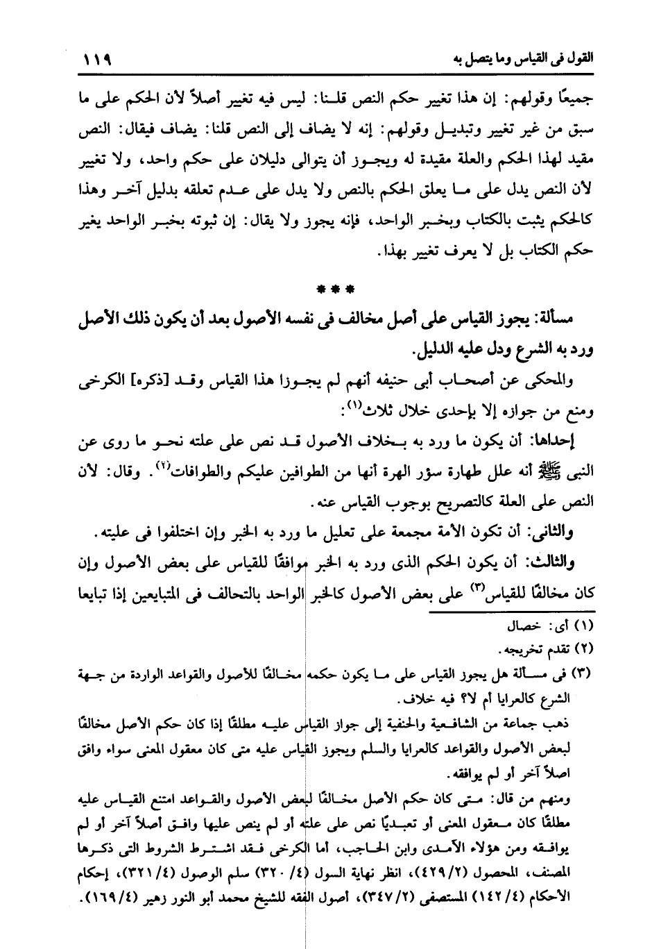3 في مسألة هل يجوز القياس على مايكون حكمه مخالفا للأصول والقواعد الواردة من جهة الشرع كالعرايا أم لا؟ فيه خلاف.