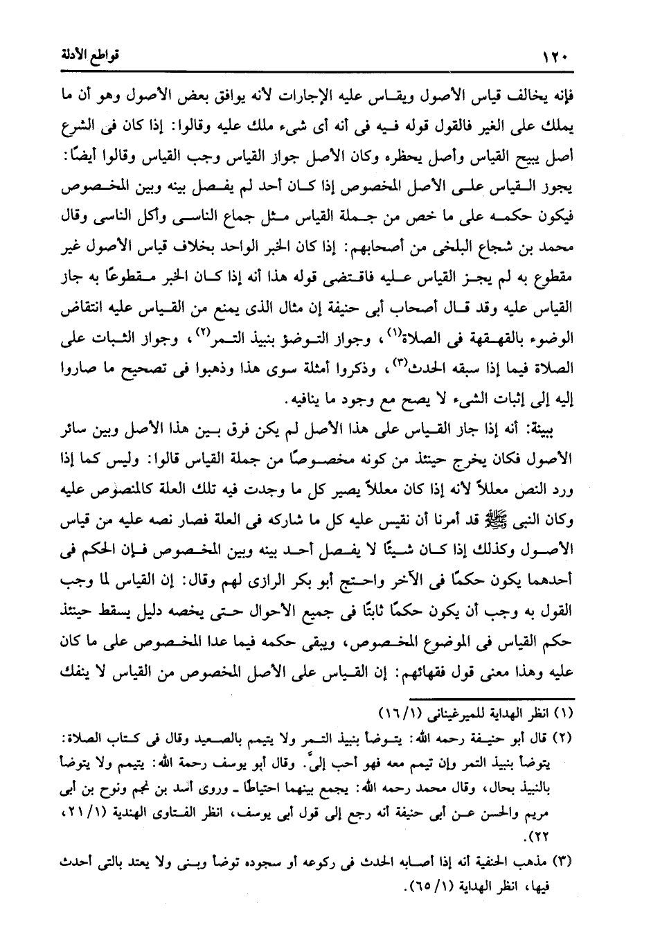فإنه يخالف قياس الأصول ويقاس عليه الإجارات لأنه يوافق بعض الأصول وهو أن ما يملك على الغير فالقول قوله فيه في أنه أى شئ ملك عليه وقالوا: إذا كان في الشرع أصل يبيح القياس وأصل يحظره وكان الأصل جواز القياس وجب القياس وقالوا أيضا يجوز القياس على الأصل المخصوص إذا كان أحد لم يفصل بينه وبين المخصوص فيكون حكمه على ما خص من جملة القياس مثل جماع الناسى وأكل الناسى وقال محمد بن شجاع البلخى من أصحابهم: إذا كان الخبر الواحد بخلاف قياس الأصول غير مقطوع به لم يجز القياس عليه فاقتضى قوله هذا أنه إذا كان الخبر مقطوعا به جاز القياس عليه وقد قال أصحاب أبى حنيفة: إن مثال الذي يمنع من القياس عليه انتقاض الوضوء بالقهقهة في الصلاة1 وجواز التوضؤ بنبيذ التمر2 وجواز الثبات على الصلاة فيما إذا سبقه الحدث3 وذكروا أمثلة سوى هذا وذهبوا في تصحيح ما صاروا إليه إلى إثبات الشئ لا يصح مع وجود ما ينافيه.