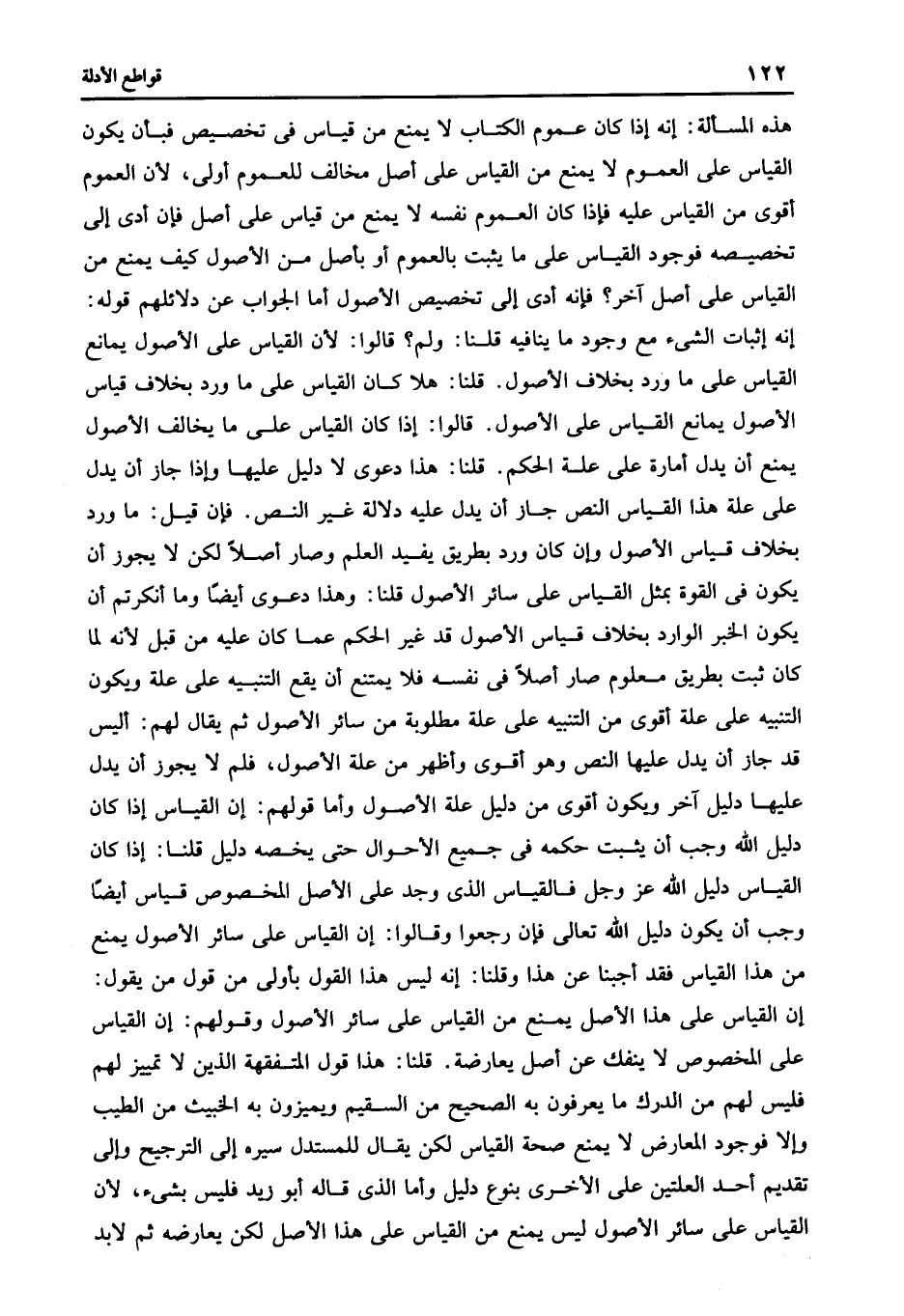 هذه المسألة: إنه إذا كان عموم الكتاب لا يمنع من قياس في تخصيص فبأن يكون القياس على العموم لا يمنع من القياس على أصل مخالف للعموم أولى لأن العموم أقوى من القياس عليه فإذا كان العموم نفسه لا يمنع من قياس على أصل فإن أدى إلى تخصيصه فوجود القياس على ما يثبت بالعموم أو بأصل من الأصول كيف يمنع من القياس على أصل آخر فإنه أدى إلى تخصيص الأصول أما الجواب عن دلائلهم قوله إنه إثبات الشئ مع وجود ما ينافيه قلنا: ولم؟ قالوا: لأن القياس على الأصول يمانع القياس على ما ورد بخلاف الأصول. قلنا: هلا كان القياس على ما ورد بخلاف قياس الأصول يمانع القياس على الأصول. قالوا: إذا كان القياس على ما يخالف الأصول يمنع أن يدل أمارة على علة الحكم. قلنا: هذا دعوى لا دليل عليها وإذا جاز أن يدل على علة هذا القياس النص جاز أن يدل عليه دلالة غير النص فإن قيل: ما ورد بخلاف قياس الأصول وإن كان ورد بطريق يفيد العلم وصار أصلا لكن لا يجوز أن يكون في القوة بمثل القياس على سائر الأصول قلنا: وهذا دعوى أيضا وما أنكرتم أن يكون الخبر الوارد بخلاف قياس الأصول قد غير الحكم عما كان عليه من قبل لأنه لما كان ثبت بطريق معلوم صار أصلا في نفسه فلا يمتنع أن يقع التنبيه على علة ويكون التنبيه على علة أقوى من التنبيه على علة مطلوبة من سائر الأصول ثم يقال: لهم أليس قد جاز أن يدل عليها النص وهو أقوى وأظهر من علة الأصول فلم لا يجوز أن يدل عليهما دليل آخر ويكون أقوى من دليل علة الأصول وأما قولهم إن القياس إذا كان دليل الله وجب أن يثبت حكمه في جميع الأحوال حتى يخصه دليل قلنا: إذا كان القياس دليل الله عز وجل فالقياس الذى وجد على الأصل المخصوص قياس أيضا وجب أن يكون دليل الله تعالى فإن رجعوا وقالوا إن القياس على سائر الأصول يمنع من هذا القياس فقد أجبنا عن هذا وقلنا إنه ليس هذا القول باولى من قول من يقول إن القياس على هذا الأصل يمنع من القياس على سائر الأصول وقولهم إن القياس على المخصوص لا ينفك عن أصل يعارضه قلنا: هذا قول المتفقهة الذين لا تمييز لهم فليس لهم من الدرك ما يعرفون به الصحيح من السقيم ويميزون به الخبيث من الطيب وإلا فوجود المعارض لا يمنع صحة القياس لكن يقال: للمستدل سيره إلى الترجيح وإلى تقديم أحد العلتين على الأخرى بنوع دليل وأما الذى قاله أبو زيد فليس بشئ لأن القياس على سائر الأصول ليس يمنع من القياس على هذا الأصل لكن يعارضه ثم لابد