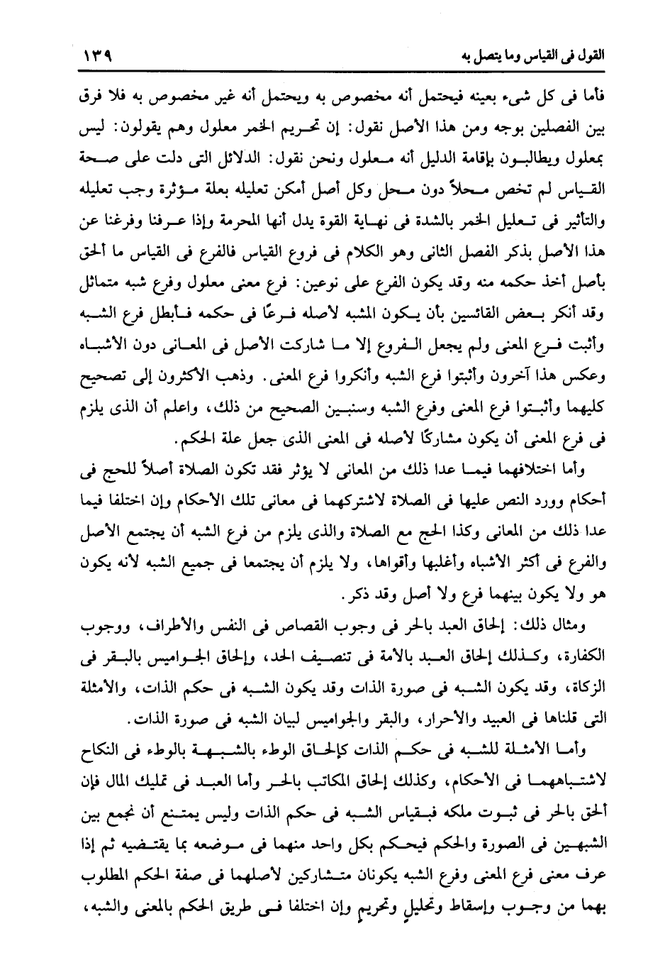 فأما في كل شئ بعينه فيحتمل أنه مخصوص به ويحتمل أنه غير مخصوص به فلا فرق بين الفصلين بوجه ومن هذا الأصل نقول: إن تحريم الخمر معلول وهم يقولون: ليس بمعلول ويطالبون بإقامة الدليل أنه معلول ونحن نقول الدلائل التي دلت على صحة القياس لم تخص محلا دون محل وكل أصل أمكن تعليله بعلة مؤثرة وجب تعليله والتأثير في تعليل الخمر بالشدة في نهاية القوة يدل أنها المحرمة وإذا عرفنا وفرغنا عن هذا الأصل بذكر الفصل الثانى وهو الكلام في فروع القياس فالفرع في القياس ما ألحق بأصل أخذ حكمه منه وقد يكون الفرع على نوعين فرع معنى معلول وفرع شبه متماثل وقد أنكر بعض القائسين بأن يكون المشبه لأصله فرعا في حكمه فابطل فرع الشبه وأثبت فرع المعنى ولم يجعل الفروع إلا ما شاركت الأصل في المعانى دون الأشباه وعكس هذا آخرون وأثبتوا فرع الشبه وأنكروا فرع المعنى وذهب الأكثرون إلى تصحيح كليهما وأثبتوا فرع المعنى وفرع الشبه وسنبين الصحيح من ذلك واعلم أن الذى يلزم في فرع المعنى أن يكون مشاركا لأصله في المعنى الذى جعل علة الحكم.