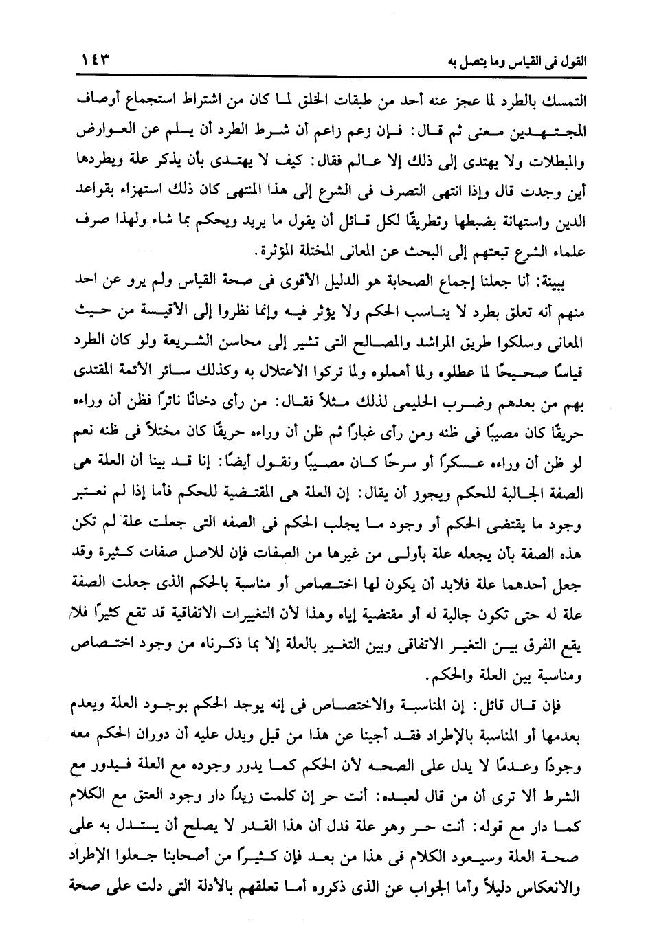 ببينة: أنا جعلنا إجماع الصحابة هو الدليل الأقوى في صحة القياس ولم يرو عن احد منهم أنه تعلق بطرد لا يناسب الحكم ولا يؤثر فيه وإنما نظروا إلى الأقيسة من حيث المعانى وسلكوا طريق المراشد والمصالح التي تشير إلى محاسن الشريعة ولو كان الطرد قياسا صحيحا لما عطلوه لوما أهملوه ولما تركوا الاعتلال به وكذلك سائر الأئمة االمقتدى بهم من بعدهم وضرب الحليمى لذلك مثلا فقال من رأى دخانا نائرا فظن أن وراءه حريقا كان مصيبا في ظنه ومن رأى غبارا ثم ظن أن وراءه حريقا كان مختلا في ظنه نعم لو ظن أن وراءه عسكرا أو سرحا كان مصيبا ونقول أيضا أنا قد بينا أن العلة هى الصفة الجالبة للحكم ويجوز أن يقال: إن العلة هى المقتضية للحكم فأما إذا لم نعتبر وجود ما يقتضى الحكم أو وجود ما يجلب الحكم في الصفة التي جعلت علة لم تكن هذه الصفة بأن يجعله علة بأولى من غيرها من الصفات فإن للاصل صفات كثيرة وقد جعل أحدهما علة فلابد أن يكون لها اختصاص أو مناسبة بالحكم الذى جعلت الصفة علة له حتى تكون جالبة له أو مقتضية إياه وهذا لأن التغييرات الاتفاقية قد تقع كثيرا فلا يقع الفرق بين التغير الاتفاقى وبين التغير بالعلة إلا بما ذكرناه من وجود اختصاص ومناسبة بين العلة والحكم.