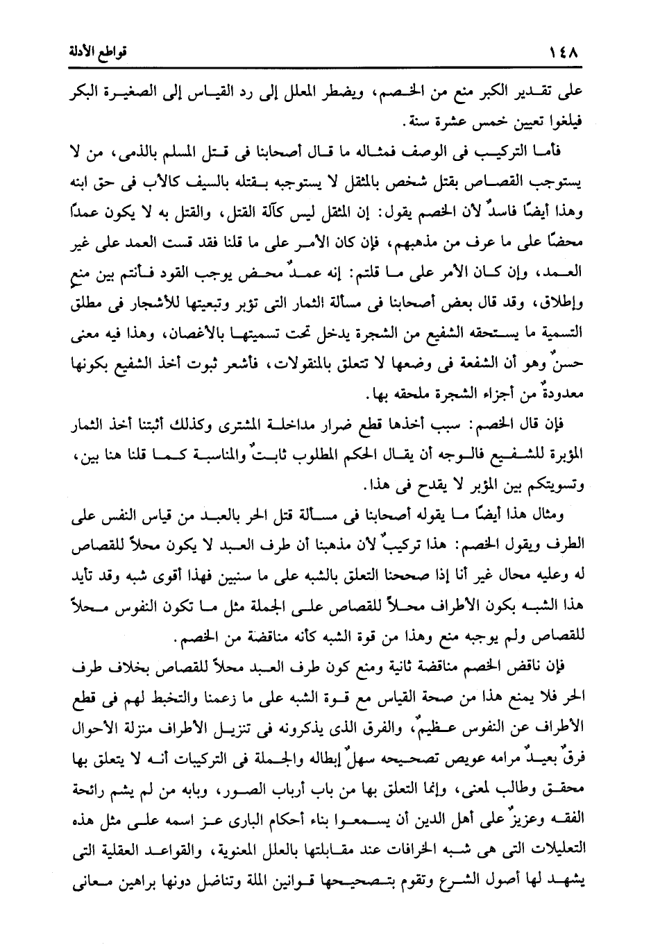 فإن ناقض الخصم مناقضة ثانية ومنع كون طرف العبد محلا للقصاص بخلاف طرف الحر فلا يمنع هذا من صحة القياس مع قوة الشبه على ما زعمنا والتخبط لهم في قطع الأطراف عن النفوس عظيم والرفق الذى يذكرونه في تنزيل الأطراف منزلة الأحوال فرق بعيد مرامه عويص تصحيحه سهل إبطاله والجملة في التركيبات أنه لا يتعلق بها محقق وطالب لمعنى وإنما التعلق بها من باب أرباب الصور وبابه من لم يشم رائحة الفقه وعزيز على أهل الدين أن يسمعوا بناء أحكام البارى عز اسمه على مثل هذه التعليلات التي هى شبه الخرافات عند مقابلتها بالعلل المعنوية والقواعد العقلية التي يشهد لها أصول الشرع وتقوم يتصحيحها قوانين الملة وتناضل دونها براهين معانى