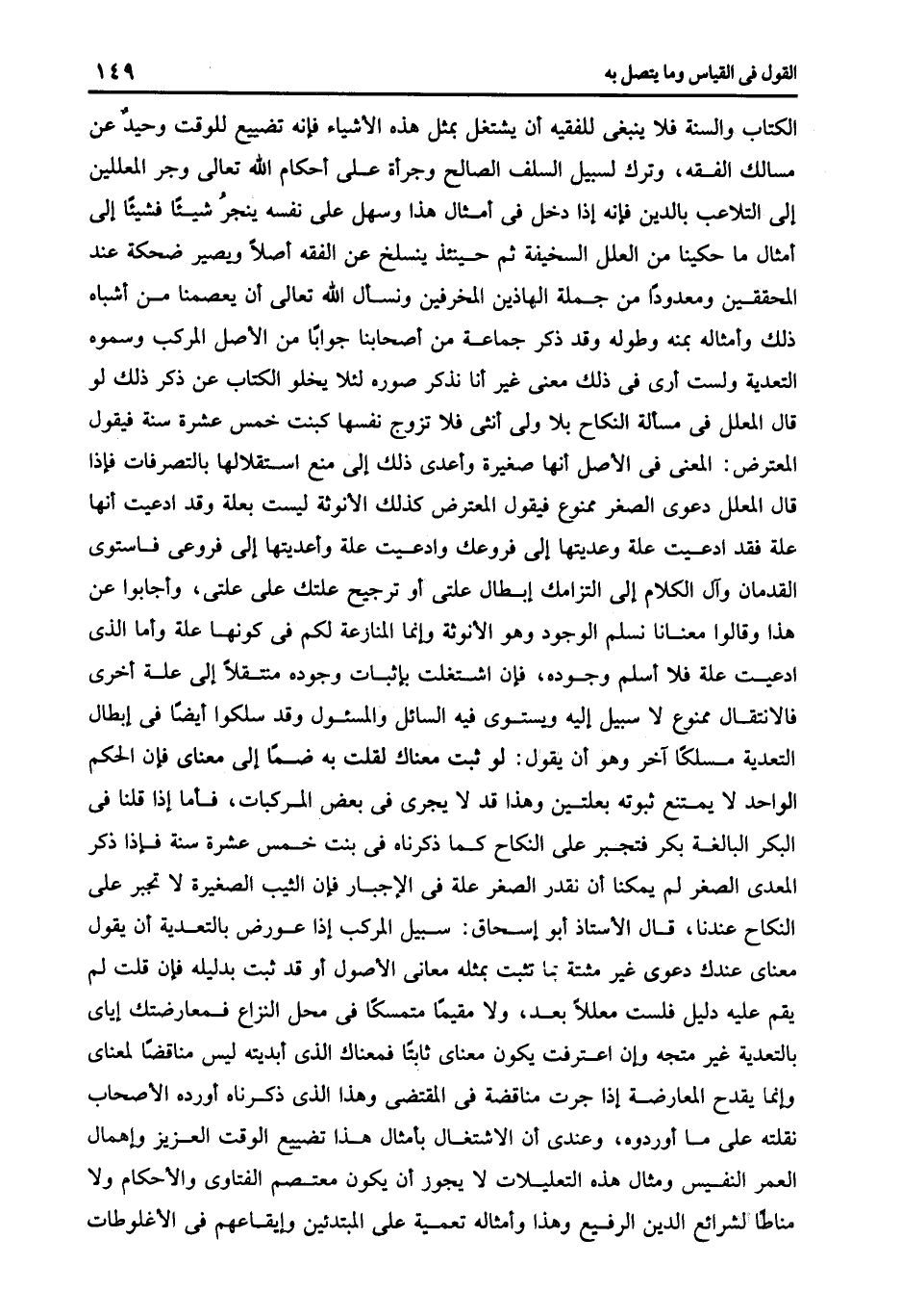 الكتاب والسنة فلا ينبغى للفقيه أن يشتغل بمثل هذه الأشياء فإنه تضييع للوقت وحيد عن مسالك الفقه وترك لسبيل السلف الصالح وجرأة على أحكام الله تعالى وجر المعللين إلى التلاعب بالدين فإنه إذا دخل في أمثال هذا وسهل على نفسه ينجر شيئا فشيئا إلى أمثال ما حكينا من العلل السخيفة ثم حينئذ ينسلخ عن الفقه أصلا ويصير ضحكة عند المحققين ومعدودا من جملة الهاذين المخرفين ونسأل الله تعالى أن يعصمنا من أشباه ذلك وأمثاله بمنه وطوله وقد ذكر جماعة من أصحابنا جوابا من الأصل المركب وسموه التعدية ولست أرى في ذلك معنى غير أنا نذكر صوره لئلا يخلو الكتاب عن ذكر ذلك لو قال المعلل في مسألة النكاح بلا ولى أنثى فلا توزج نفسها كبنت خمس عشرة سنة فيقول المعترض المعنى في الأصل أنها صغيرة وأعدى ذلك إلى منع استقلالها بالتصرفات فإذا قال المعلل دعوى الصغر ممنوع فيقول المعترض كذلك الأنوثة ليست بعلة وقد أدعيت أنها ععلة فقد ادعيت علة وعديتها إلى فروعك وادعيت علة وأعديتها إلى فروعى فاستوى القدمان وآل الكلام إلى التزامك إبطال علتى أو ترجيح علتك على علتى وأجابوا عن هذا وقالوا معنانا نسلم الوجود وهو الأنوثة وإنما المنازعة لكم في كونها علة وأما الذى ادعيت علة فلا أسلم وجوده فإن اشتغلت بإثبات وجوده منتقلا إلى علة أخرى فالانتقال ممنوع لا سبيل إليه ويستوى فيه السائل والمسئول وقد سلكوا أيضا في إبطال التعدية مسلكا آخر وهو أن يقول لو ثبت معناك لقلت به ضما إلى معناى فإن الحكم الواحد لا يمتنع ثبوته بعلتين وهذا قد لا يجرى في بعض المركبات فأما إذا قلنا في البكر البالغة بكر فتجبر على النكاح كما ذكرناه في بنت خمس عشرة سنة فإذا ذكر المعدى الصغر لم يمكنا أن نقدر الصغر علة في الإجبار فإن الثيب الصغيرة لا تجبر على النكاح عندنا قال الأستاذ أبو إسحاق سبيل المركب إذا عورض بالتعدية أن يقول معناى عندك دعوى غير مثبتة بما تثبت بمثله معانى الأصول أو قد ثبت بدليله فإن قلت لم يقم عليه دليل فلست معللا بعد ولا مقيما متمسكا في محل النزاع فمعارضتك إياى بالتعدية غير متجه وإن اعترفت يكون معناى ثابتا فمعناك الذي أبديته ليس مناقضا لمعناى وإنما يقدح المعارضة إذا جرت مناقضة في المقتضى وهذا الذى ذكرناه أورده الأصحاب نقلته على ما أوردوه وعندي أن الاشتغال بأمثال هذا تضييع الوقت العزيز وإهمال العمر النفيس ومثال هذه التعليلات لا يجوز أن يكون معتصم الفتاوى والأحكام ولا مناطا لشرائع الدين الرفيع وهذا وأمثاله تعمية على المبتدئين وإيقاعهم في الأغلوطات