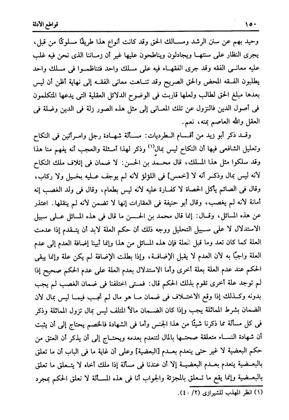 وقد ذكر أبوزيد من أقسام الطرديات: مسألة شهادة رجل وأمراتين في النكاح وتعليل الشافعي فيها أن النكاح ليس بمال1 وذكر لهذا أمثلة والعجب أنه يفهم منا هذا وقد سلكوا مثل هذا المسلك قال محمد بن الحسن: لا ضمان في إتلاف ملك النكاح لأنه ليس بمال وذكر أنه لا [خمس] في اللؤلؤ لأنه لم يوجف عليه بخيل ولا ركاب وقال في الصائم يأكل الحصاة لا كفارة عليه لأنه ليس بطعام وقال في ولد الغصب إنه أمانة لأنه لم يغصب وقال أبو حنيفة في العقارات إنها لا تضمن لأنه لم ينقلها اعتذر عن هذه المسائل وقال: إنما قال محمد بن الحسن ما قال في هذه المسائل على سبيل الاستدلال لا على سبيل التحليل ووجه ذلك ان حكم العلة لابد أن يتقدم إذا عدمت العلة كما كان تعد وما قبل العلة فإن هذه المسائل من هذا وإنما أبينا إضافة العدم إلى عدم العلة واجبا به لأن العدم لا يقبل الإضافة وإذا بطلت الإضافة لم يكن علة وإنما يبقى الحكم عند عدم العلة بعلة أخرى وأما الاستدلال بعدم العلة على عدم الحكم صحيح إذا لم توجد علة أخرى تقوم بذلك الحكم قال فمتى اختلفنا في ضمان الغصب لم يجب بدونه وكذلك إذا وقع الاختلاف في ضمان ما هو مال لم تجب فيما ليس بمال لأن الضمان بشرط المماثلة يجب وإذا كان الضمان مالا المتلف ليس بمال تزول المماثلة وذكر في كل مسألة مما ذكرنا شيئا من هذا الجنس وأما في الشهادة فالخصم يحتاج إلى أن يثبت أن شهادة النساء متعلقة صحتها بالمال لتنعدم بعدمه ويحتاج إلى أن يذكر أن العتق من حكم البعضية لا غير حتى ينعدم بعدم [البعضية] وعلى أن غاية ما في الباب أن ما تعلق بالبعضية ينعدم بعدم البعضية إلا أن عندنا في مسألة إذا ملك أخاه لا يتعلق ما تعلق بالبعضية وإنما يقع ما تعلق بالمجزئة والجواب أنا في هذه المسألة لا نعلق الحكم بمجرد