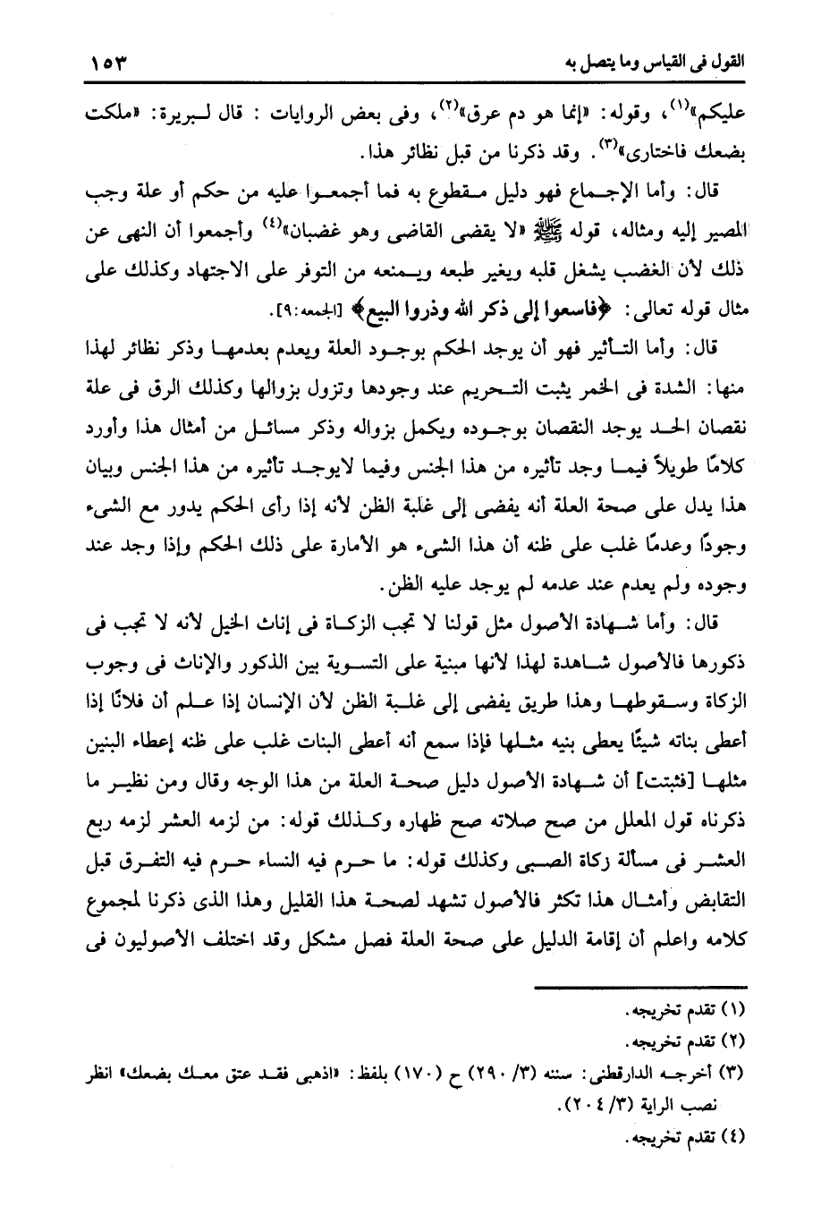 قال: وأما الإجماع فهو دليل مقطوع به فما أجمعوا عليه من حكم أو علة وجب المصير إليه ومثاله قوله صلى الله عليه وسلم: "لا يقضى القاضي وهو غضبان" 4 وأجمعوا أن النهى عن ذلك لأن الغضب يشغل قلبه ويغير طبعه ويمنعه من التوفر على الاجتهاد وكذلك على مثال قوله تعالى {فَاسَعَوْا إِلَى ذِكْرِ اللَّهِ وَذَرُوا الْبَيْعَ} [الجمعة: 9] .