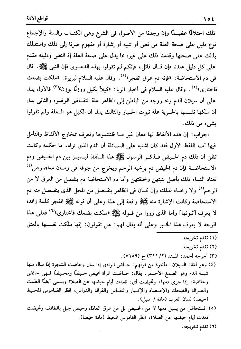 الجواب: إن هذه الألفاظ لها معان غير ما ظننتموها وتعرف بمخارج الألفاظ والتأمل فيها أما اللفظ الأول فقد كان اشتبه على السائلة أن الدم الذى تراه ما حكمه وكانت تظن أن ذلك دم حيض فذكر الرسول صلى الله عليه وسلم هذا اللفظ ليميز بين دم الحيض ودم الاستحاضة فإن دم الحيض دم يرخيه الرحم ويخرج من جوفه في زمان مخصوص4 تعتاد النساء ذلك بأصل بنيتهن وخلقتهن وأما دم الاستحاضة دم ينفصل من العرق لا من الرحم5 ولا رخاء لذلك وإن كان في الظاهر ينفصل من المحل الذى ينفصل منه دم الاستحاضة وكانت الإشارة منه صلى الله عليه وسلم واقعة إلى هذا وعلى أن قوله صلى الله عليه وسلم انفجر كلمة زائدة لا يعرف [ثبوتها] وأما الذى رووا من قوله صلى الله عليه وسلم: "ملكت بضعك فاختاري" 6 فعلى هذا الوجه لا يعرف هذا الخبر وعلى أنه يقال لهم هل تقولون: إنها ملكت نفسها بالعتق