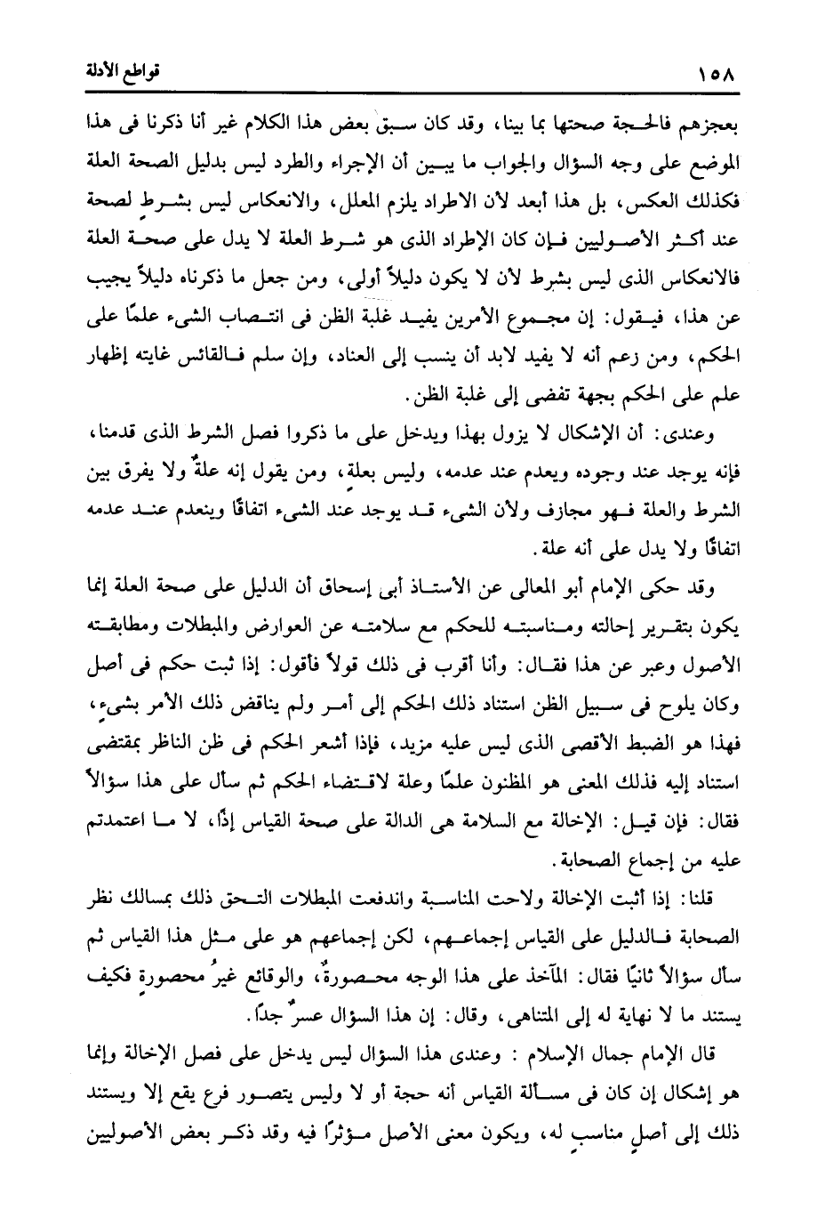 قلنا: إذا أثبت الإخالة ولاحت المناسبة واندفعت المبطلات التحق ذلك بمسالك نظر الصحابة فالدليل على القياس إجماعهم لكن إجماعهم هو على مثل هذا القياس ثم سأل سؤالا فقال المآخذ على هذا الوجه محصورة والوقائع غير محصورة فكيف يستند ما لا نهاية له إلى المتناهى وقال إن هذا السؤال عسر جدا.