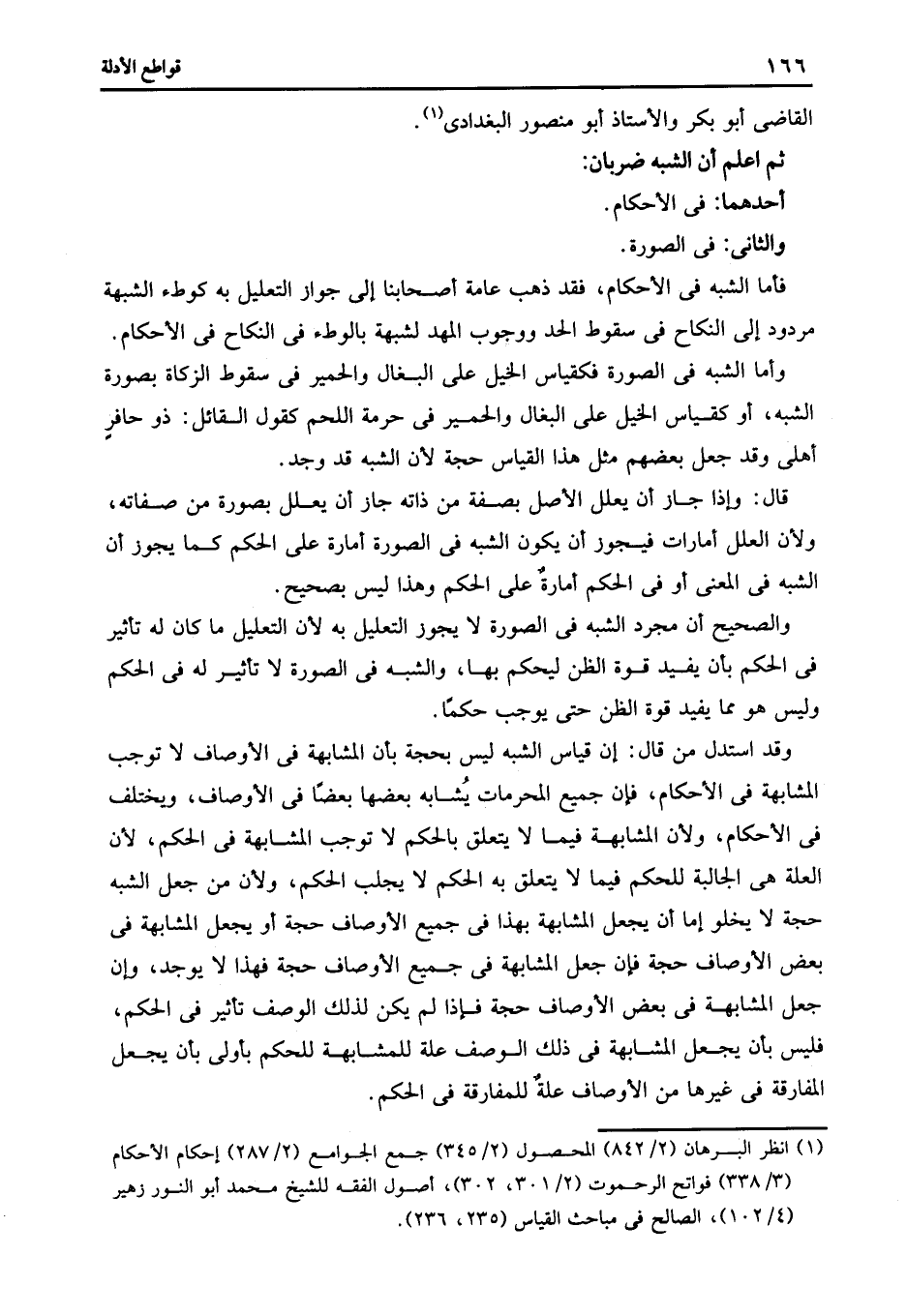 وأما الشبه في الصورة فكقياس الخيل على البغال والحمير في سقوط الزكاة بصورة الشبه أو كقياس الخيل على البغال والحمير في حرمة اللحم كقول القائل: ذو حافر أهلى وقد جعل بعضهم مثل هذا القياس حجة لأن الشبه قد وجد.
