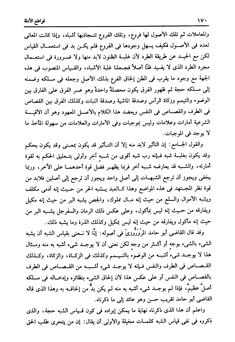 والمعاملات ثم تلك الأصول لها فروع وتلك الفروع تتجاذبها أشباه وإذا كانت المعانى تعدد في الأصول فكيف يسهل وجودها في الفروع فلم يكن بد في استعمال القياس لكن مع الحيد عن طريقة الطرد لأن غلبة الظنون لابد منها ولا ضرورة في استعمال مجرد الطرد الذى لا يفيد ظنا أصلا فجعلنا غلبة الأشباه والقياس المنصوب في هذه الجهة مع وجود ما يقرب في الظن إلحاق الفرع بذلك الأصل وجعله في مسلكه وضمنه إلى مسلكه حجة ثم ظهور الفرق يكون محصلة واحدة وهو عسر الفرق على الفارق بين الوضوء والتيمم وزكاة الرأس وصدقة الماشية وصدقة النبات وكذلك الفرق بين القصاص في الطرف والقصاص في النفس ويعضد هذا الكلام بالأصل المعهود وهو أن الأقيسة الشرعية أمارات وعلامات وليس بموجبات وفى الأمارات والعلامات من سهولة المأخذ ما لا يوجد في الموجبات.