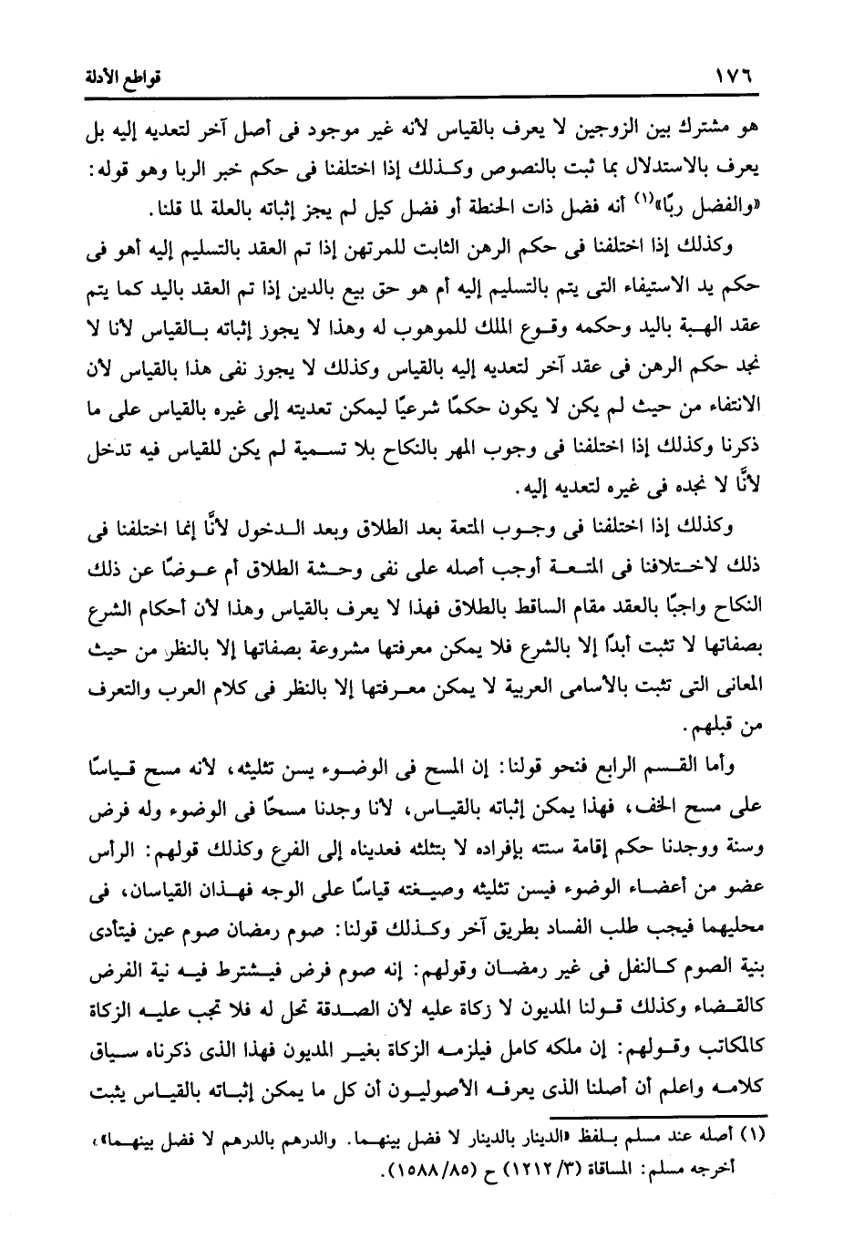 وأما القسم الر ابع فنحو قولنا: إن المسح في الضوء يسن تثليثه لأنه مسح قياسا على مسح الخف فهذا يمكن إثباته بالقياس لأنا وجدنا مسحا في الوضوء وله فرض وسنة ووجدنا حكم إقامة سنته بإفراده لا يتثليثه فعديناه إلى الفرع وكذلك قولهم: الرأس عضو من أعضاء الوضوء فيسن تثليثه وصيغته قياسا على الوجه فهذان القياسان في محليهما فيجب طلب الفساد بطريق آخر وكذلك قولنا: صوم رمضان صوم عين فيتأدى بنية الصوم كالنفل في غير رمضان وقولهم إنه صوم فرض فيشترط فيه نية الفرض كالقضاء وكذلك قولنا: المديون لا زكاة عليه لأن الصدقة تحل له فلا تجب عليه الزكاة كالمكاتب وقولهم إن ملكه كامل فيلزمه الزكاة بغير المديون فهذا الذى ذكرناه سياق كلامه واعلم أن أصلنا الذى يعرفه الأصوليون أن كل ما يمكن إثباته بالقياس يثبت
