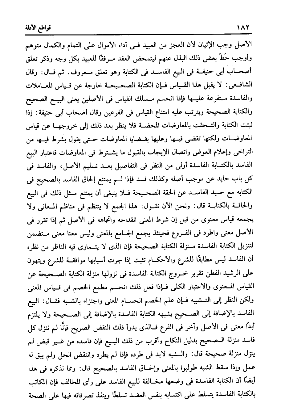 الأصل وجب الإتيان لأن العجز من العبيد في أداء الأموال على التمام والكمال متوهم وأوجب حط بعض ذلك البذل عنهم ليتمحض العقد مرفقا للعبيد بكل وجه وذكر تعلق أصحاب أبى حنيفه في البيع الفاسد في الكتابة وهو تعلق معروف ثم. قال: وقال الشافعى: لا يقبل هذا القياس فإن الكتابة الصحيحة خارجة عن قياس المعاملات والفاسدة متفرعة عليها فإذا انحسم مسلك القياس في الأصلين يعنى البيع الصحيح والكتابة الصحيحة ويترتب عليه امتناع القياس في الفرعين وقال أصحاب أبى حنيفة: إذا ثبتت الكتابة والتحقت بالمعاوضات المحضة فلا ينظر بعد ذلك إلى خروجها عن قياس المعاوضات ولكنها تقضى فيها وعليها بقضايا المعاوضات حتى يقول بشرط فيها من التراخى وإعلام العوض واتصال الإيجاب بالقبول ما يشترط في المعاوضات فاعتبار البيع الفاسد بالكتابة الفاسدة أولى من النظر في التفاصيل بعد تسليم الأصل والفاسد في كل باب حايد عن موجب أصله وكذلك فسد فإذا لم يمتنع إلحاق الفاسد بالصحيح في الكتابة مع حيد الفاسد عن الحقة الصحيحة فلا ينبغى أن يمتنع مثل ذلك في البيع والحاقة بالكتابة قال: ونحن الآن نقول: هذا الجمع لا ينتظم في مناظم المعانى ولا يجمعه قياس معنوى من قبل إن شرط المعنى انقداحه واتجاهه في الأصل ثم إذا تقرر في الأصل معنى واطرد في الفروع فحينئذ يجمع الجامع بالمعنى وليس معنا معنى متضمن لتنزيل الكتابة الفاسدة منزلة الكتابة الصحيحة فإن الذى لا يتمارى فيه الناظر من نظره أن الفاسد ليس مطابقا للشرع والأحكام تثبت إذا جرت أسبابها موافقة للشرع ويتهون على الرشيد الفطن تقرير خروج الكتابة الفاسدة في نزولها منزلة الكتابة الصحيحة عن القياس المعنوي والاعتبار الكلى فإذا فعل ذلك انحسم مطمع الخصم في قياس المعنى ولكن النظر إلى التشبيه فإن علة الخصم انحسام المعنى واجتزاء بالشبه فقال البيع الفاسد بالإضافة إلى الصحيح يشبهه الكتابة الفاسدة بالإضافة إلى الصحيحة ولا يلتزم أبدا معنى في الأصل وآخر في الفرع فالذى يدرأ ذلك النقض الصريح فإنا لم ننزل كل فاسد منزلة الصحيح بدليل النكاح وأقرب من ذلك البيع فإن فاسده من غير قبض لم ينزل منزلة صحيحة قال: والشبه لابد في طرده فإذا لم يطرد وانتقض انحل ولم يبق له عمل وإذا سقط الشبه طولبوا بالمعنى وإلحاق الفاسد بالصحيح قال: ومما نذكره في هذا أيضا أن الكتابة الفاسدة في وضعها مخالفة للبيع الفاسد على رأى المخالف فإن المكاتب بالكتابة الفاسدة يتسلط على اكتسابه بنفس العقد تسلطا وينفذ تصرفاته فيها على الصحة