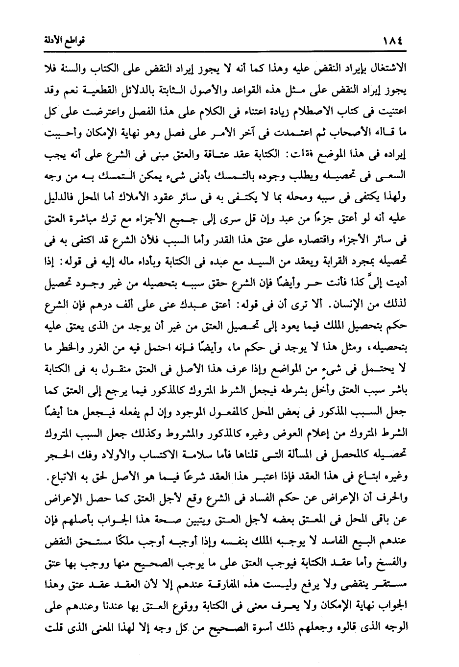 الاشتغال بإيراد النقض عليه وهذا كما أنه لا يجوز إيراد النقض على الكتاب والسنة فلا يجوز إيراد النقض على مثل هذه القواعد والأصول الثابته بالدلائل القطعية نعم وقد اعتنيت في كتاب الاصطدام زيادة اعتناء في الكلام على هذا الفصل واعترضت على كل ما قاله الاصحاب ثم اعتمدت في آخر الأمر على فصل وهو نهاية الإمكان وأحببت إيراده في هذا الموضع فقلت: الكتابة عقد عتاقة والعتق مبنى في الشرع على أنه يجب السعى في تحصيله ويطلب وجوده بالتمسك بأدنى شئ يمكن التمسك به من وجه ولهذا يكتفى في سببه ومحله بما لا يكتفى به في سائر عقود الأملاك أما المحل فالدليل عليه أنه لو أعتق جزءا من عبد وإن قل سرى إلى جميع الأجزاء مع ترك مباشرة العتق في سائر الأجزاء واقتصاره على عتق هذا القدر وأما السبب فلأن الشرع قد اكتفى به في تحصيله بمجرد القرابة ويعقد من السيد مع عبده في الكتابة بأداء ماله إليه في قوله إذا أديت إلى كذا فأنت حر وأيضا فإن الشرع حقق سببه بتحصيله من غير وجود تحصيل لذلك من الإنسان. ألا ترى أن في قوله أعتق عبدك عنى على ألف درهم فإن الشرع حكم بتحصيل الملك فيما يعود إلى تحصيل العتق من غير أن يوجد من الذى يعتق عليه بتحصيله ومثل هذا لا يوجد في حكم ما وأيضا فإنه احتمل فيه من الغرر والخطر ما لا يحتمل في شئ من المواضع وإذا عرف هذا الأصل في العتق منقول به في الكتابة باشر سبب العتق وأخل بشرطه فيجعل الشرط المتروك كالمذكور فيما يرجع إلى العتق كما جعل السبب المذكور في بعض المحل كالمفعول الموجود وإن لم يفعله فيجعل هنا أيضا الشرط المتروك من إعلام العوض وغيره كالمذكور والمشروط وكذلك جعل السبب المتروك تحصيله كالمحصل في المسألة التي قلناها فأما سلامة الاكتساب والأولاد وفك الحجر وغيره ابتاع في هذا العقد فإذا اعتبر هذا العقد شرعا فيما هو الأصل لحق به الاتباع. والحرف أن الإعتراض عن حكم الفساد في الشرع وقع لأجل العتق كما حصل الإعراض عن باقى المحل في المعتق بعضه ويتبين صحة هذا الجواب بأصلهم فإن عندهم البيع الفاسد لا يوجبه الملك بنفسه وإذا أوجبه أوجب ملكا مستحق النقض والفسخ وأما عقد الكتابة فيوجب العتق على ما يوجب الصحيح منها ووجب بها عتق مستقر ينقضى ولا يرفع وليست هذه المفارقة عندهم إلا لأن العقد عقد عتق وهذا الجواب نهاية الإمكان ولا يعرف معنى في الكتابة ووقوع العتق بها عندنا وعندهم على الوجه الذى قالوه وجعلهم ذلك أسوة الصحيح من كل وجه إلا لهذا المعنى الذى قلت