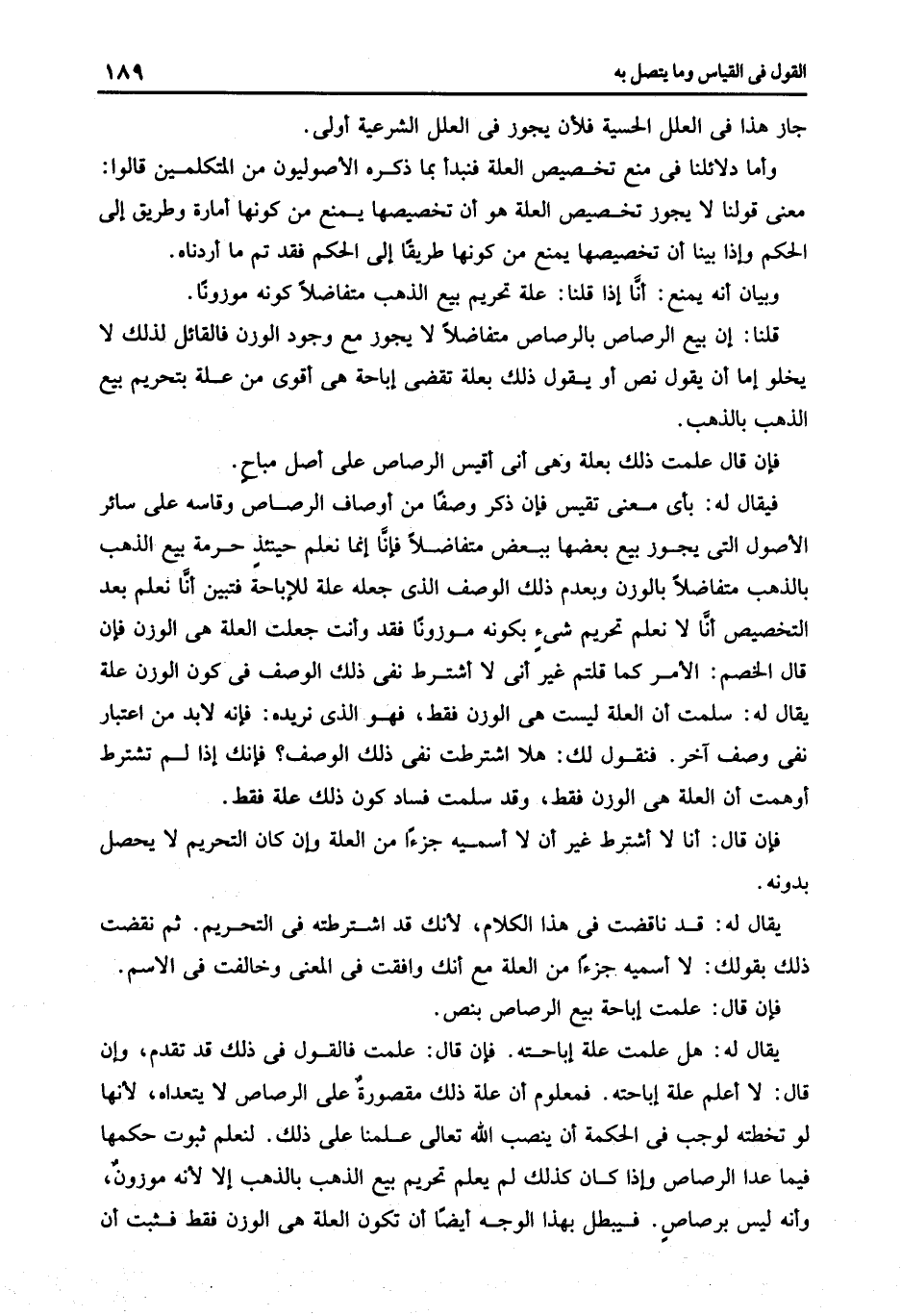 فيقال له: بأي معنى تقيس فإن ذكر وصفا من أوصاف الرصاص وقاسه على سائر الأصول التي يجوز بيع بعضها ببعض متفاضلا فإنا إنما نعلم حينئذ حرمة بيع الذهب باذهب متفاضلا بالوزن وبعدم ذلك الوصف الذي جعله علة للإباحة فتبين أنا نعلم بعد التخصيص أنا لا نعلم تحريم شئ بكونه موزونا فقد وأنت جعلت العلة هي الوزن فإن قال: الخصم الأمر كما قلتم غير أنى لا اشترط نفى ذلم الوصف في كون الوزن علة يقال: له سلمت أن العة ليست هى الوزن فقط فهو الذي نريده فإنه لابد من اعتبار نفى وصف آخر. فنقول لك: هلا اشترطت نفى ذلك الوصف؟ فإنك إذا لم تشترط أوهمت أن العة هي الوزن فقط وقد سلمت فساد كون ذلك علة فقط.