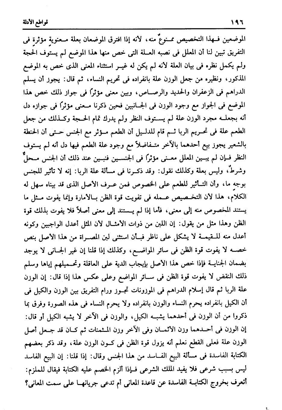الموضعين فهذا التخصيص ممنوع منه لأنه إذا افترق الموضعان بعلة معنوية مؤثرة في التفريق تبين لنا أن المعلل في نصبه العلة التي خص منها هذا الموضع لم يستوف الحجة ولم يكمل نظره في بيان العلة لأنه لم يكن له غير استثناء المعنى الذى خص به الموضع المذكور ونظيره من جعل الوزن علة بانفراده في تحريم النساء ثم قال: يجوز أن يسلم الدراهم في الزعفران والحديد والرصاص وبين معنى مؤثرا في جواز ذلك خص هذا الموضع في الجواز مع وجود الوزن في الجانبين فحين ذكرنا معنى مؤثرا في جوازه دل أنه بجعله مجرد الوزن علة لم يستوف النظر ولم يدرك تمام الحجة وكذلك من جعل الطعم علة في تحريم الربا ثم قام للدليل أن الطعم مؤثر مع الجنس حتى أن الحنطة بالشعير يجوز بيع أحدهما بالآخر متفاضلا مع وجود علة الطعم فيها دل أنه لم يستوف النظر فإن لم يبين المعلل معنى مؤثرا في الجنسين فنبين عند ذلك أن الجنس محل وشرط وليس بعلة وكذلك نقول وقد ذكرنا في مسألة علة الربا إنه لا تأثير للجنس بوجه ما وأن التأثير للطعم على الخصوص فمن عرف الأصل الذى قد بيناه سهل له الكلام هذا لأن التخصيص عمله في تفويت قوة الظن بالأمارة وإنما يفوت مثل ما يستند المخصوص منه إلى معنى فأما إذا لم يستند إلى معنى أصلا فلا يفوت بذلك قوة الظن وهذا مثل من يقول إن اللبن من ذوات الأمثال لأن المثل أعدل الواجبين وكونه أعدل منه للقيمة لا يشكل على ناظر فبأن استثنى لبن المصراة من هذا الأصل بنص خصه لا يفوت قوة الظن في سائر المواضع وكذلك إذا قلنا: إن غير الجانى لا يوجد بضمان الجناية فإذا خص هذا الأصل بإيجاب الدية على العاقلة وتحميلهم إياها وسلم ذلك النقض لا يفوت قوة الظن في سائر المواضع وعلى عكس هذا إذا قال: إن الوزن علة الربا ثم قال: إسلام الدراهم في الموزونات تجوز ورام التفريق بين الوزن والكيل في أن الكيل بانفراده يحرم النساء والوزن بانفراده ولا يحرم النساء في هذه الصورة وفرق بما ذكروا من أن الوزن في أحدهما يشبه الكيل والوزن في الآخر لا يشبه الكيل أو قال: إن الوزن في أحدهما وزن الأثمان وفى الآخر وزن المثمنات ثم كان قد جعل أصل الوزن علة فعلى القطع نعلم أنه يزول قوة الظن في كون الوزن علة وقد ذكر بعضهم الكتابة الفاسدة في مسألة البيع الفاسد من هذا الجنس وقال: إذا قلنا: إن البيع الفاسد ليس بسبب شرعى فلا يفيد الملك الشرعى فإذا ألزم الخصم عليه الكتابة فيقال للملزم أتعرف بخروج الكتابة الفاسدة عن قاعدة المعانى أم تدعى جريانها على سمت المعاني؟