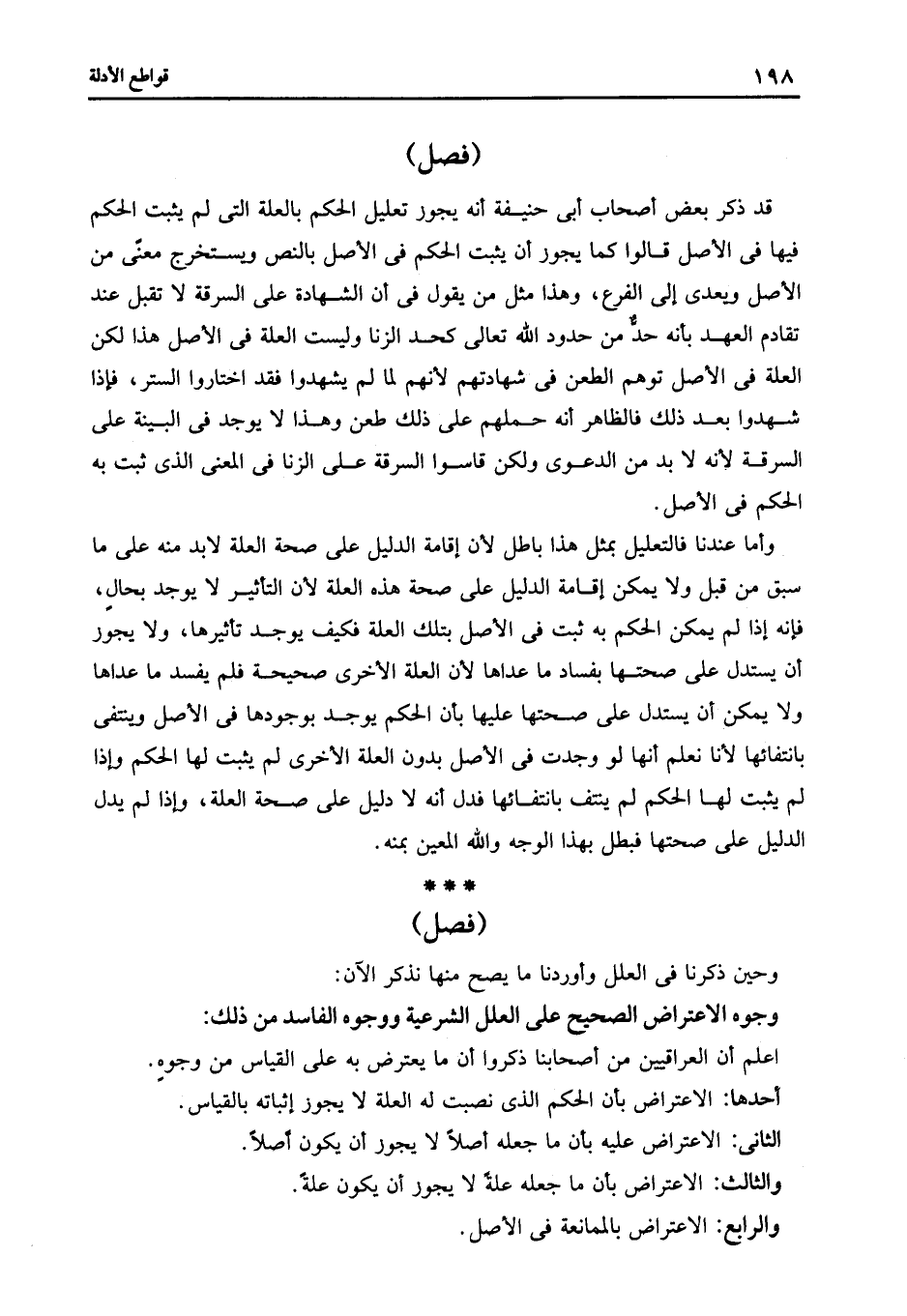 وأما عندنا فالتعليل بمثل هذا باطل لأن إقامة الدليل على صحة العلة لابد منه على ما سبق من قبل ولا يمكن إقامة الدليل على صحة هذه العلة لأن التأثير لا يوجد بحال فإنه إذا لم يمكن الحكم به ثبت في الأصل بتلك العلة فكيف يوجد تأثيرها ولا يجوز أن يستدل على صحتها بفساد ما عداها لأن العلة الأخرى صحيحة لم يفسد ما عداها ولا يمكن أن يستدل على صحتها عليها بأن الحكم يوجد بوجودها في الأصل وينتفى بانتفائها لأنا نعلم أنها لو وجدت في الأصل بدون العلة الأخرى لم يثبت لها الحكم وإذا لم يثبت لها الحكم لم ينتف بانتفائها فدل أنه لا دليل على صحة العلة وإذا لم يدل الدليل على صحتها فبطل بهذا الوجه والله المعين بمنه.