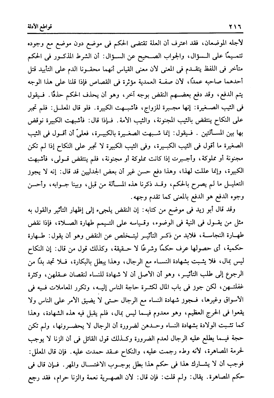 وقد قال أبو زيد في موضع من كتابه: إن النقض يلجئ إلى إظهار التأثير والقول به مثل من يقول في النية في الوضوء وقياسه على التيمم طهارة الصلاة فإذا نقض طهارة النجاسة فلابد من ذكر التأثير ليتخلص عن النقض وهو أن يقول طهارة حكمية أى حصولها عرف حكما وشرعا لا حقيقة وكذلك قول من قال إن النكاح ليس بمال فلا يثبت بشهادة النساء مع الرجال وهذا يبطل بالبكارة فلا تجد بدا من الرجوع إلى طلب التأثير وهو أن الأصل أن لا شهادة للنساء لنقصان عقلهن وكثرة غفلتهن لكن جوز في باب المال لكثرة حاجة الناس إليه وتكرر المعاملات فيه في الأسواق وغيرها فجوز شهادة النساء مع الرجال حتى لا يضيق الأمر على الناس ولا يقعوا في الحرج العظيم وهو معدوم فيما ليس بمال فلم يقبل فيه هذه الشهادة وهذا كما تثبت الولادة بشهادة النساء وحدهن لضرورة أن الرجال لا يحضرونها ولم تكن حجة فيما يطلع عليه الرجال لعدم الضرورة وكذلك قول القائل في أن الزنا لا يوجب لحرمة المصاهرة لأنه وطء رجمت عليه والنكاح عقد حمدت عليه. فإن قال المعلل فوجب أن لا يشارك هذا في حكم هذا بطل بوجوب الاغتسال والمهر. فإن قال: في حكم المصاهرة. يقال: ولم قلت فإن قال: لأن الصهرية نعمة والزنا حرام فقد رجع
