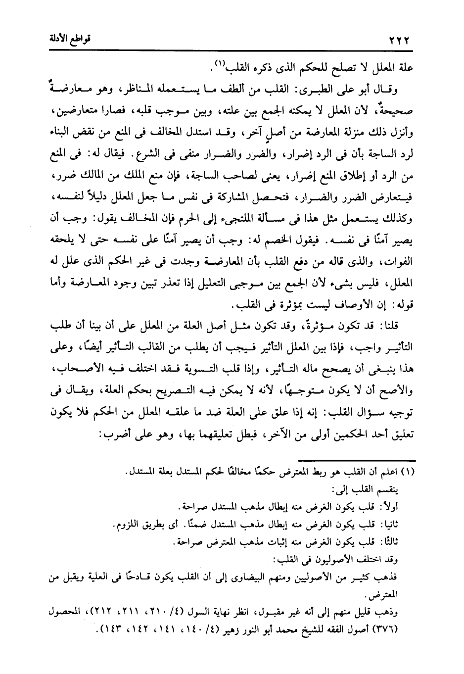 وقال أبو علي الطبرى: القلب من ألطف ما يستعمله المناظر وهو معارضة صحيحة لأن المعلل لا يمكنه الجمع بين علته وبين موجب قلبه فصارا متعارضين وأنزل ذلك منزلة المعارضة من أصل آخر وقد استدل المخالف في المنع من نقض البناء لرد الساجة بأن في الرد إضرار والضرر والضرار منفى في الشرع. فيقال له: في المنع من الرد أو إطلاق المنع إضرار يعنى لصاحب الساجة فإن منع الملك من المالك ضرر فيتعارض الضرر والضرار فتحصل المشاركة في نفس ما جعل المعلل دليلا لنفسه وكذلك يستعمل مثل هذا في مسألة الملتجئ إلى الحرم فإن المخالف يقول وجب أن يصير آمنا في نفسه. فيقول الخصم له: وجب أن يصير آمنا على نفسه حتى لا يلحقه الفوات والذى قاله من دفع القلب بأن المعارضة وجدت في غير الحكم الذى علل له المعلل فليس بشئ لأن الجمع بين موجبى التعليل إذا تعذر تبين وجود المعارضة وأما قوله: إن الأوصاف ليست بمؤثرة في القلب.