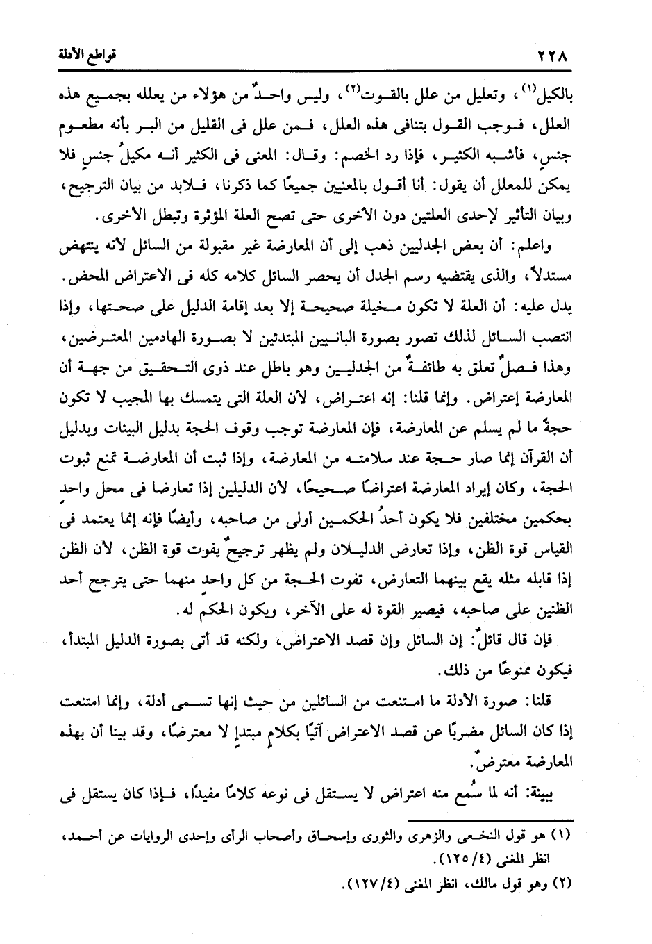 واعلم: أن بعض الجدليين ذهب إلى أن المعارضة غير مقبولة من السائل لأنه ينتهض مستدلا والذى يقتضيه رسم الجدل أن يحصر السائل كلامه كله في الاعتراض المحض يدل عليه أن العلة لا تكون مخيلة صحيحة ألا بعد إقامة الدليل على صحتها وإذا انتصب السائل لذلك تصور بصورة البانيين المبتدئين لا بصورة الهادمين المعترضيين وهذا فصل تعلق به طائفة من الجدليين وهو باطل عند ذوى التحقيق من جهة أن المعارضة اعتراض وإنما قلنا إنه اعتراض لأن العلة التي يتمسك بها المجيب لا تكون حجة ما لم يسلم عن المعارضة فإن المعارضة توجب وقوف الحجة بدليل البينات وبدليل أن القرآن إنما صار حجة عند سلامته من المعارضة وإذا ثبت أن المعارضة تمنع ثبوت الحجة وكان إيراد المعارضة اعتراضا صحيحا لأن الدليلين إذا تعارضا في محل واحد بحكمين مختلفين فلا يكون أحد الحكمين أولى من صاحبه وأيضا فإنه إنما يعتمد في القياس قوة الظن وإذا تعارض الدليلان ولم يظهر ترجيح يفوت قوة الظن لأن الظن إذا قابله مثله يقع بينهما التعارض تفوت الحجة من كل واحد منهما حتى يترجح أحد الظنين على صاحبه فيصير القوة له على الآخر ويكون الحكم له.